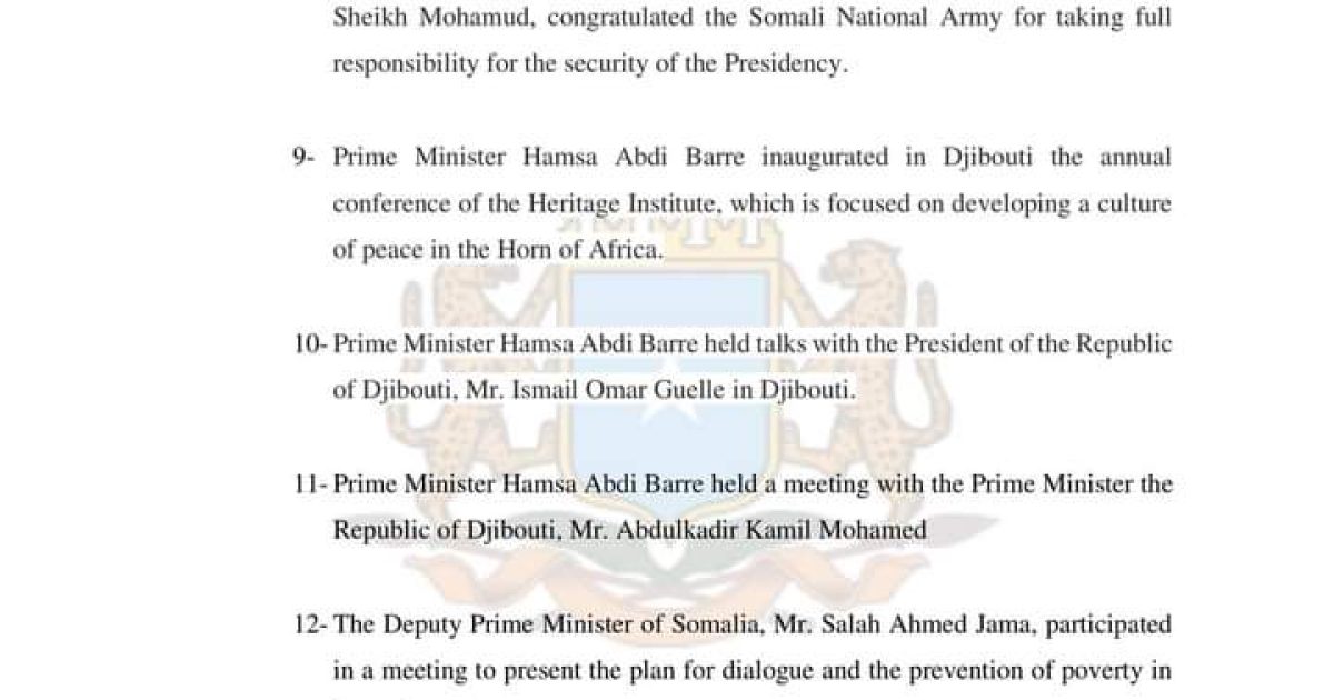 10- Prime Minister Hamsa Abdi Barre held talks with the President of the Republic of Djibouti, Mr. Ismail Omar Guelle in Djibouti.