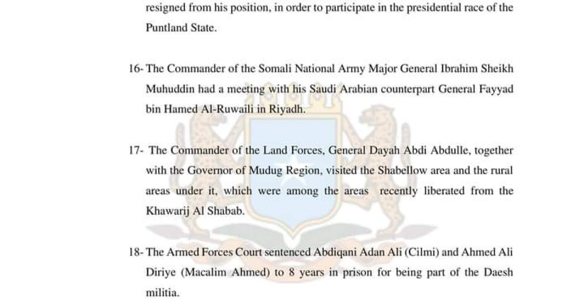 16- The Commander of the Somali National Army Major General Ibrahim Sheikh Muhuddin had a meeting with his Saudi Arabian counterpart General Fayyad bin Hamed Al-Ruwaili in Riyadh.