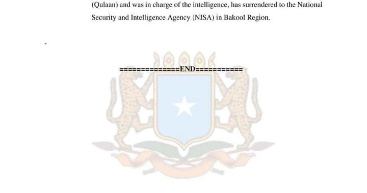 22- Ahmed Mursal Mohamed, who was known among the Kharijites Al Shabab as (Qulaan) and was in charge of the intelligence, has surrendered to the National Security and Intelligence Agency (NISA) in Bakool Region.