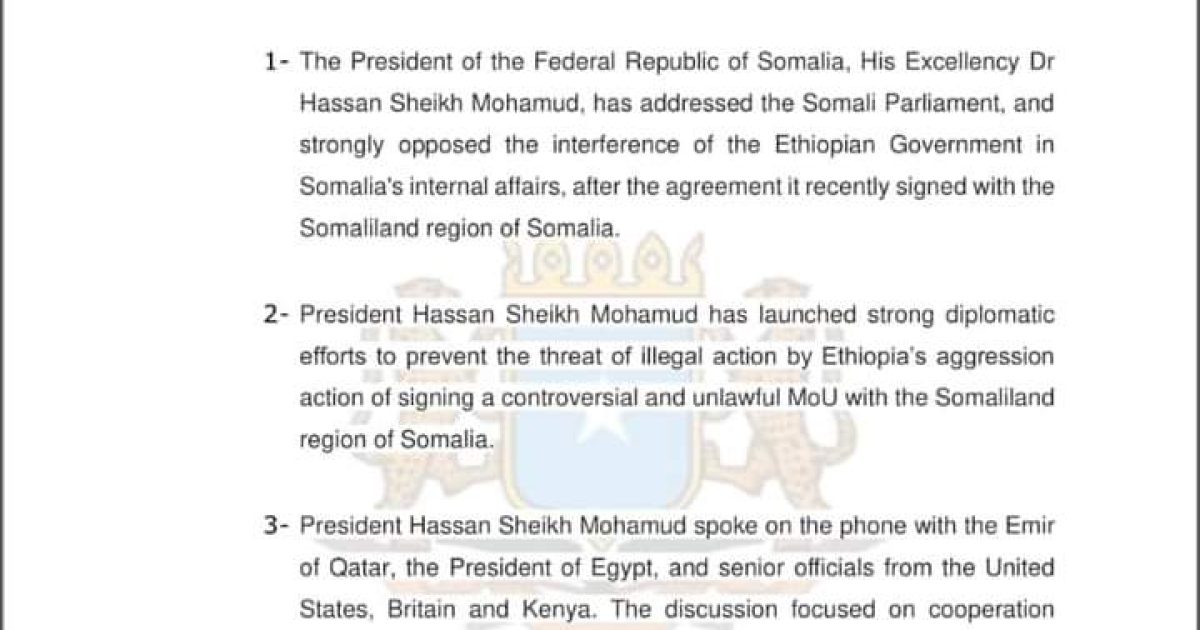 1- The President of the Federal Republic of Somalia, His Excellency Dr Hassan Sheikh Mohamud, has addressed the Somali Parliament, and strongly opposed the interference of the Ethiopian Government in Somalia’s internal affairs, after the agreement it recently signed with the Somaliland region of Somalia.