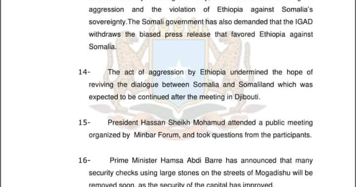 13- The Federal Government of Somalia has firmly rejected a press release issued by IGAD regional body, which seemed to concealing the aggression and the violation of Ethiopia against Somalia’s sovereignty.The Somali government has also demanded that the IGAD withdraws the biased press release that favored Ethiopia against Somalia.