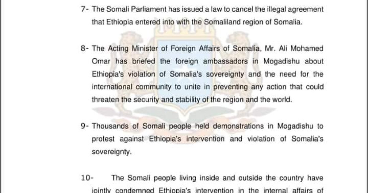 7- The Somali Parliament has issued a law to cancel the illegal agreement that Ethiopia entered into with the Somaliland region of Somalia.
