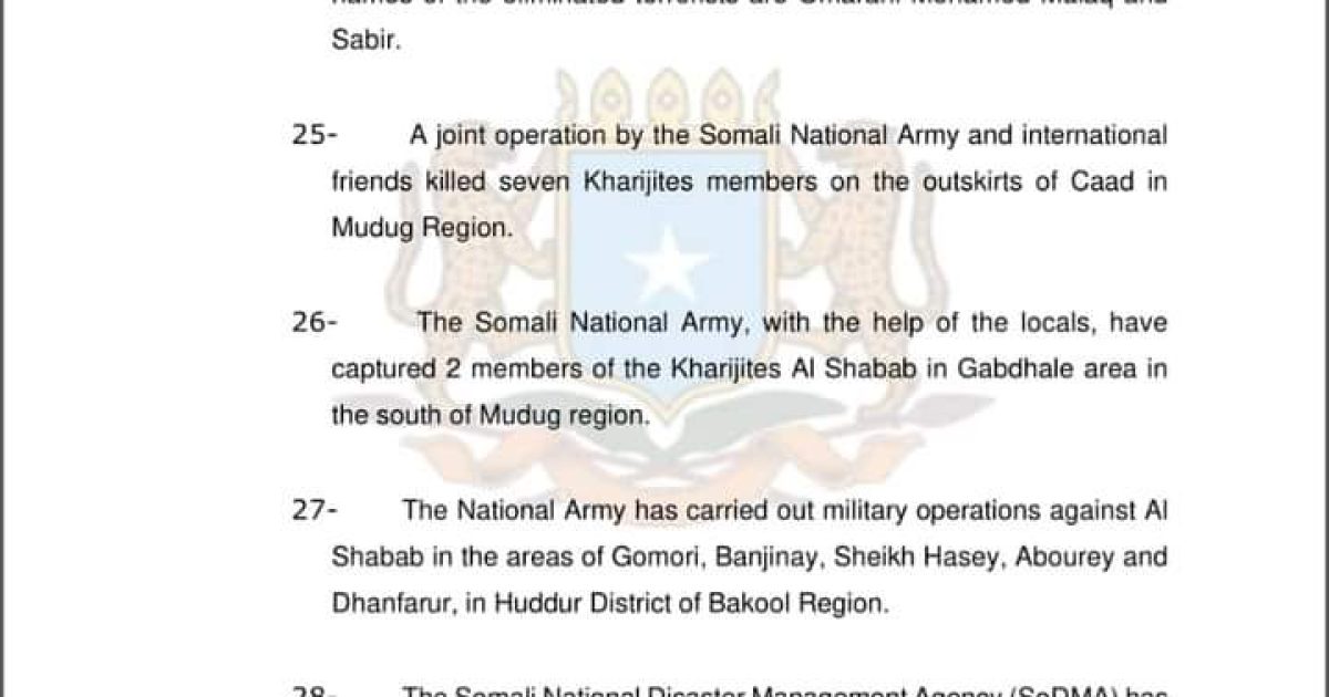 25- A joint operation by the Somali National Army and international friends killed seven Kharijites members on the outskirts of Caad in Mudug Region.