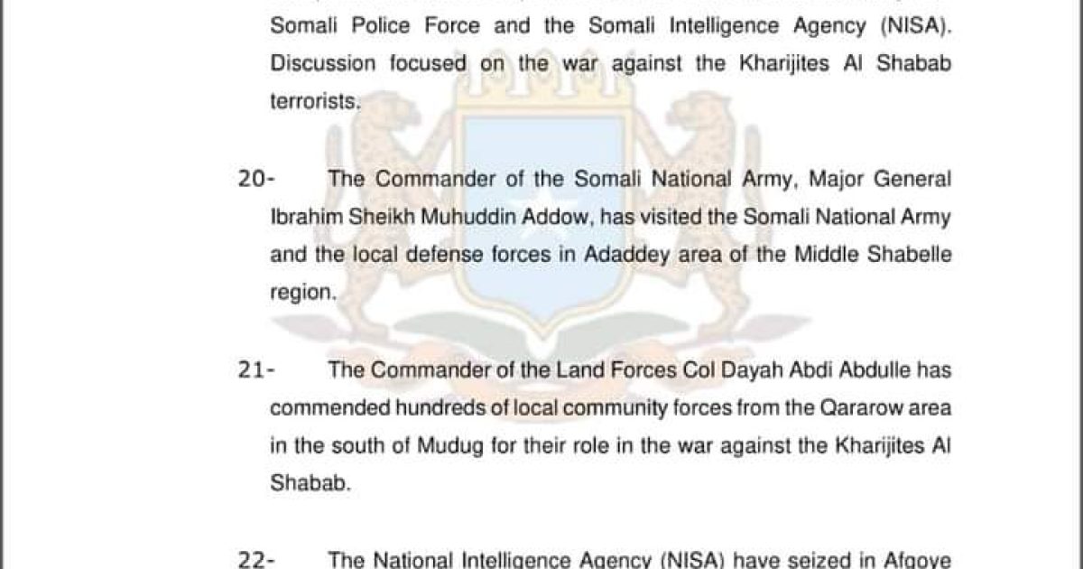 20- The Commander of the Somali National Army, Major General Ibrahim Sheikh Muhuddin Addow, has visited the Somali National Army and the local defense forces in Adaddey area of the Middle Shabelle region.