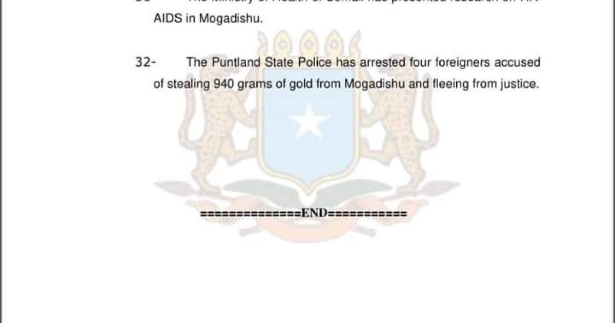 32- The Puntland State Police has arrested four foreigners accused of stealing 940 grams of gold from Mogadishu and fleeing from justice.