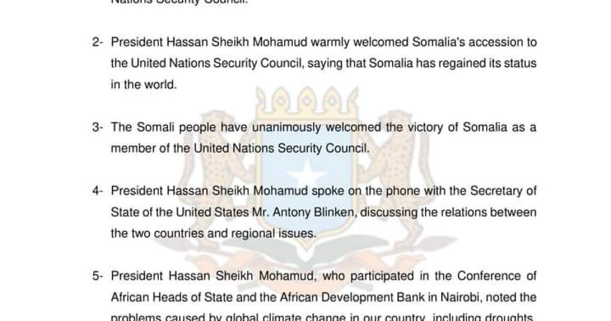 4- President Hassan Sheikh Mohamud spoke on the phone with the Secretary of State of the United States Mr. Antony Blinken, discussing the relations between the two countries and regional issues.