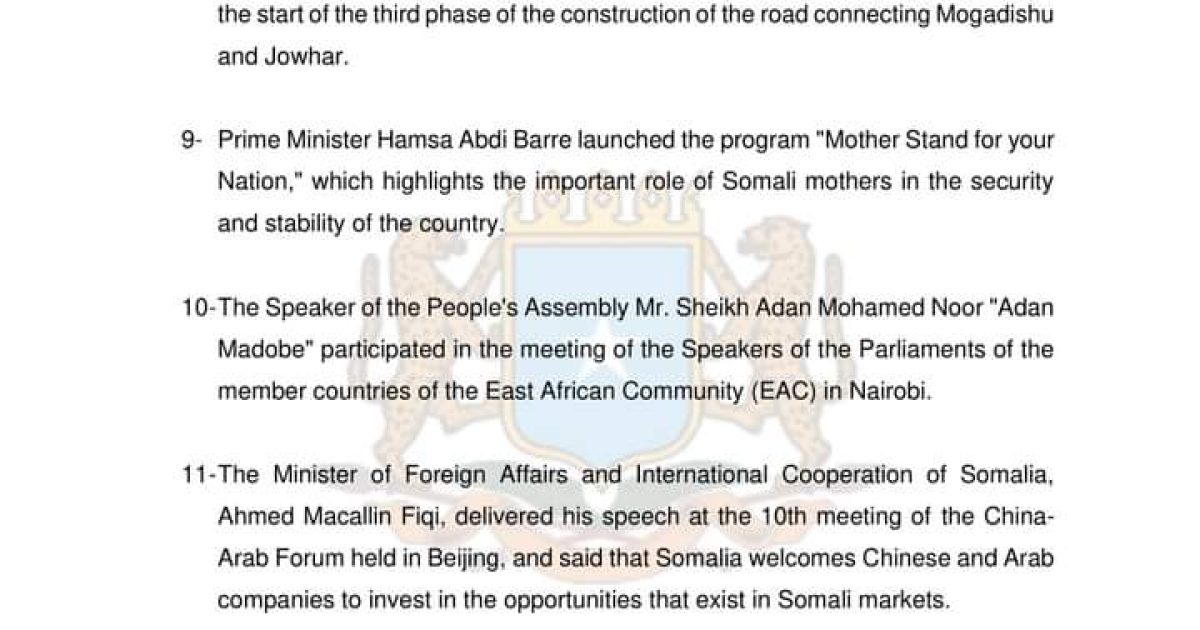 9- Prime Minister Hamsa Abdi Barre launched the program “Mother Stand for your Nation,” which highlights the important role of Somali mothers in the security and stability of the country.