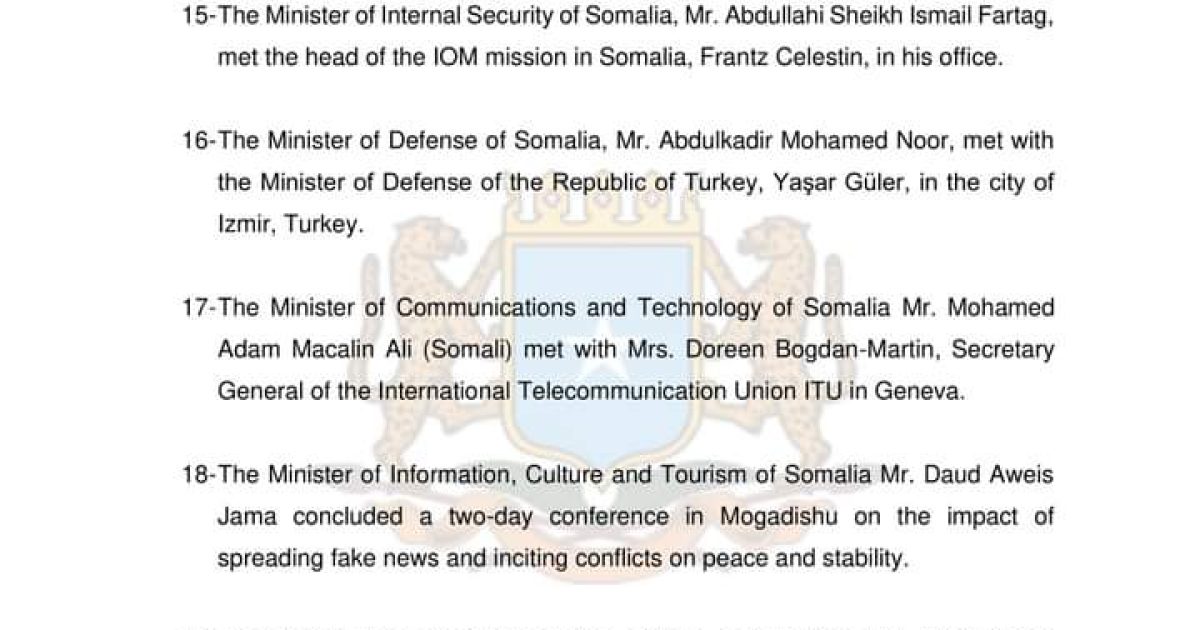18- The Minister of Information, Culture and Tourism of Somalia Mr. Daud Aweis Jama concluded a two-day conference in Mogadishu on the impact of spreading fake news and inciting conflicts on peace and stability.