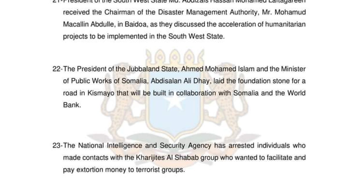 23- The National Intelligence and Security Agency has arrested individuals who made contacts with the Kharijites Al Shabab group who wanted to facilitate and pay extortion money to terrorist groups.