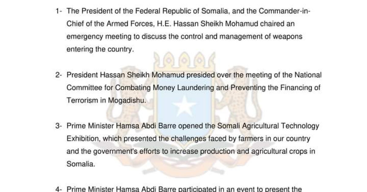 1- The President of the Federal Republic of Somalia, and the Commander-in-Chief of the Armed Forces, H.E. Hassan Sheikh Mohamud chaired an emergency meeting to discuss the control and management of weapons entering the country.