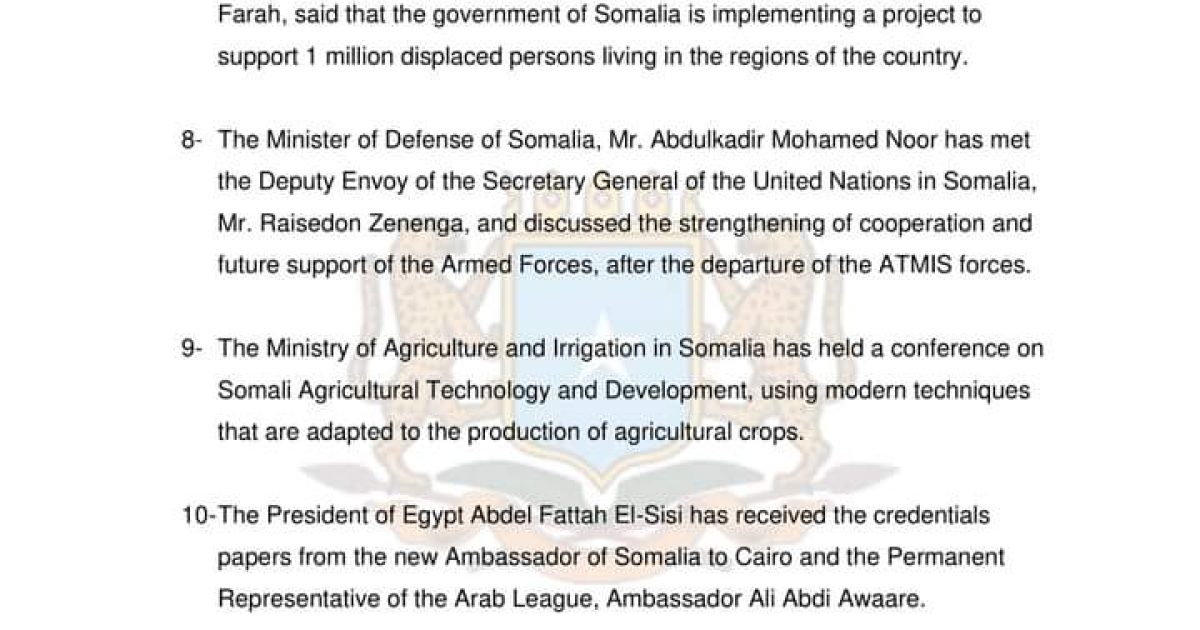 8- The Minister of Defense of Somalia, Mr. Abdulkadir Mohamed Noor has met the Deputy Envoy of the Secretary General of the United Nations in Somalia, Mr. Raisedon Zenenga, and discussed the strengthening of cooperation and future support of the Armed Forces, after the departure of the ATMIS forces.