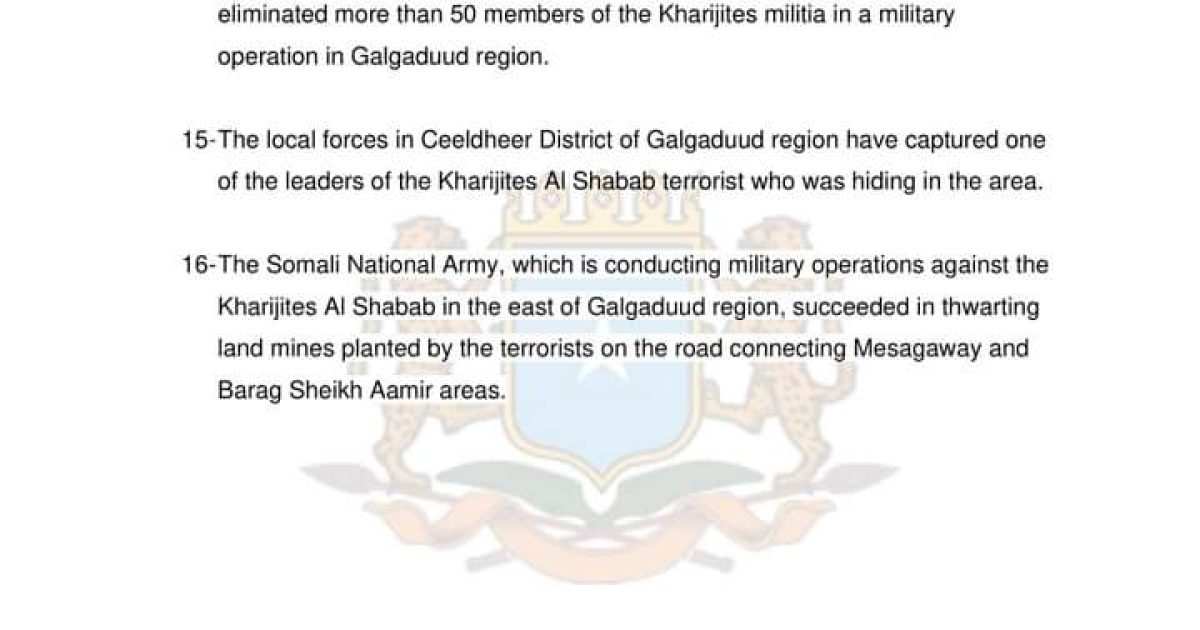 14- The Somali National Army with the help of international friends have eliminated more than 50 members of the Kharijites militia in a military operation in Galgaduud region.