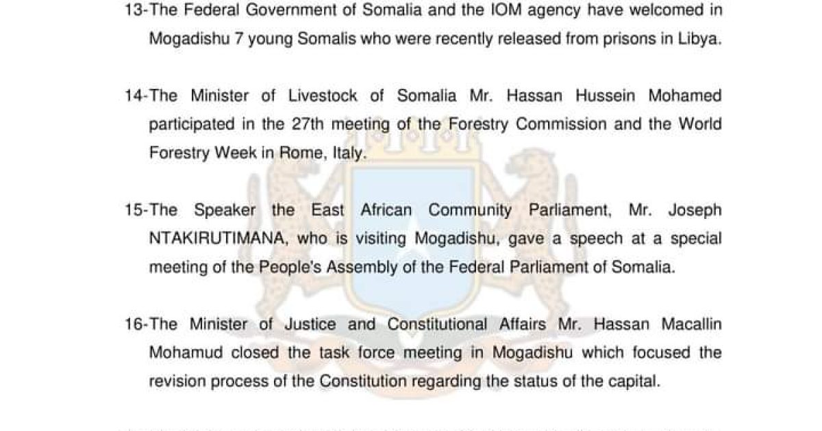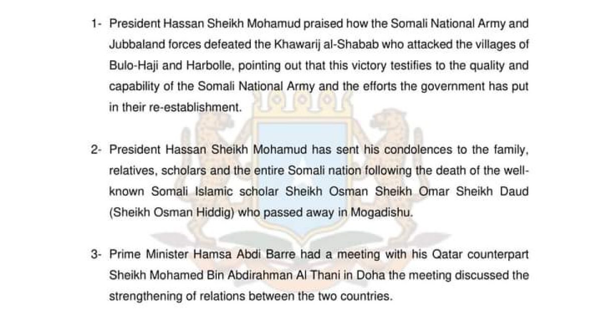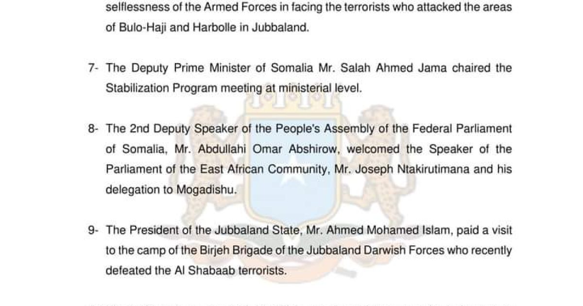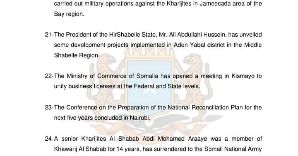1-President Hassan Sheikh Mohamud praised how the Somali National Army and Jubbaland forces defeated the Khawarij al-Shabab who attacked the villages of Bulo-Haji and Harbolle, pointing out that this victory testifies to the quality and capability of the Somali National Army and the efforts the government has put in their re-establishment.