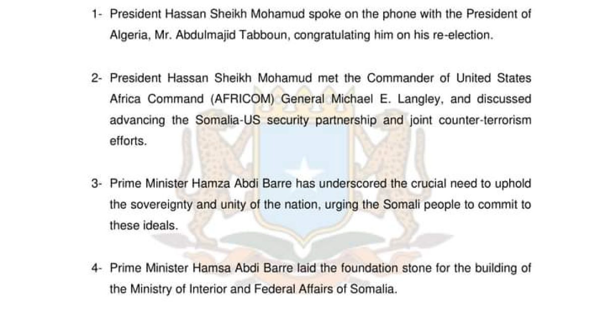 1-President Hassan Sheikh Mohamud spoke on the phone with the President of Algeria, Mr. Abdulmajid Tabboun, congratulating him on his re-election.