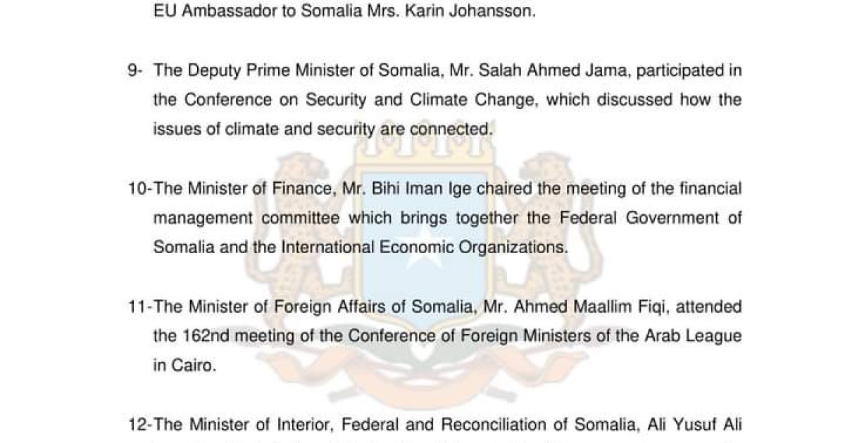 11-The Minister of Foreign Affairs of Somalia, Mr. Ahmed Maallim Fiqi, attended the 162nd meeting of the Conference of Foreign Ministers of the Arab League in Cairo.