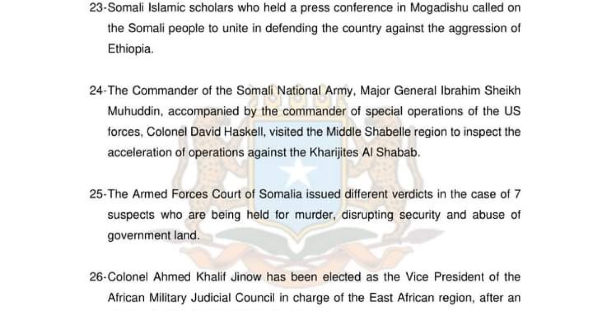 24-The Commander of the Somali National Army, Major General Ibrahim Sheikh Muhuddin, accompanied by the commander of special operations of the US forces, Colonel David Haskell, visited the Middle Shabelle region to inspect the acceleration of operations against the Kharijites Al Shabab.