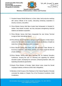 12- Prime Minister Hamza Abdi Barre launched the 3rd National Education Conference, focusing this year on reforming and upgrading the national education system, developing the curriculum, enhancing teachers’ skills, and expanding educational opportunities.