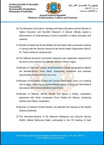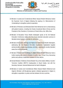 29- Ministers of Justice and Constitutional Affairs Hassan Moalim Mohamud and Algeria’s Minister Lotfi Boudjemaa signed a bilateral agreement in Algiers to strengthen cooperation in justice and law between the two countries.