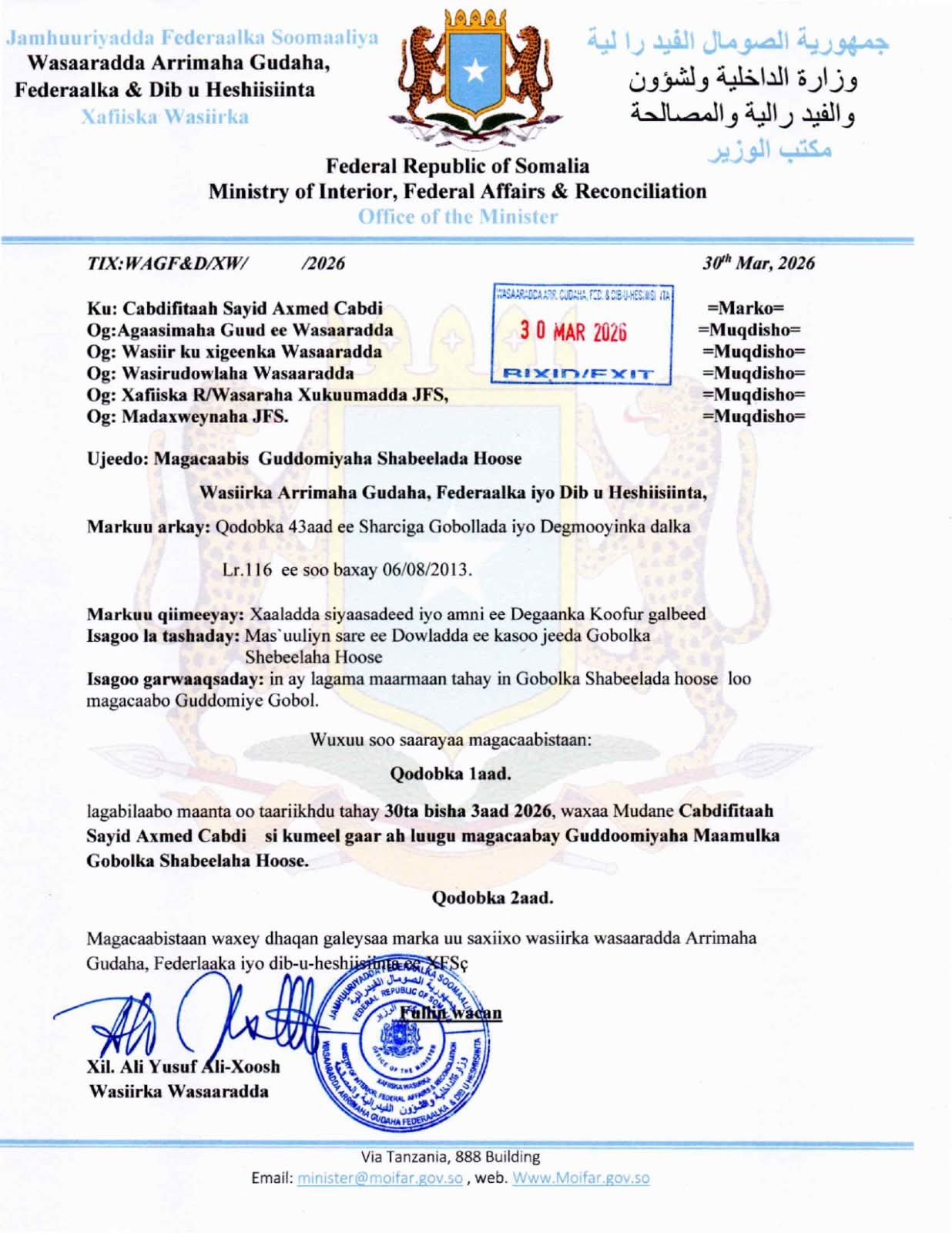 Ra’iisul Wasaaraha Xukuumadda Jamhuuriyadda Federaalka Soomaaliya Mudane Xamsa Cabdi Barre ayaa soo saaray wareegto uu kumagaacabayo Wasiir Ku xigeenno cusub...