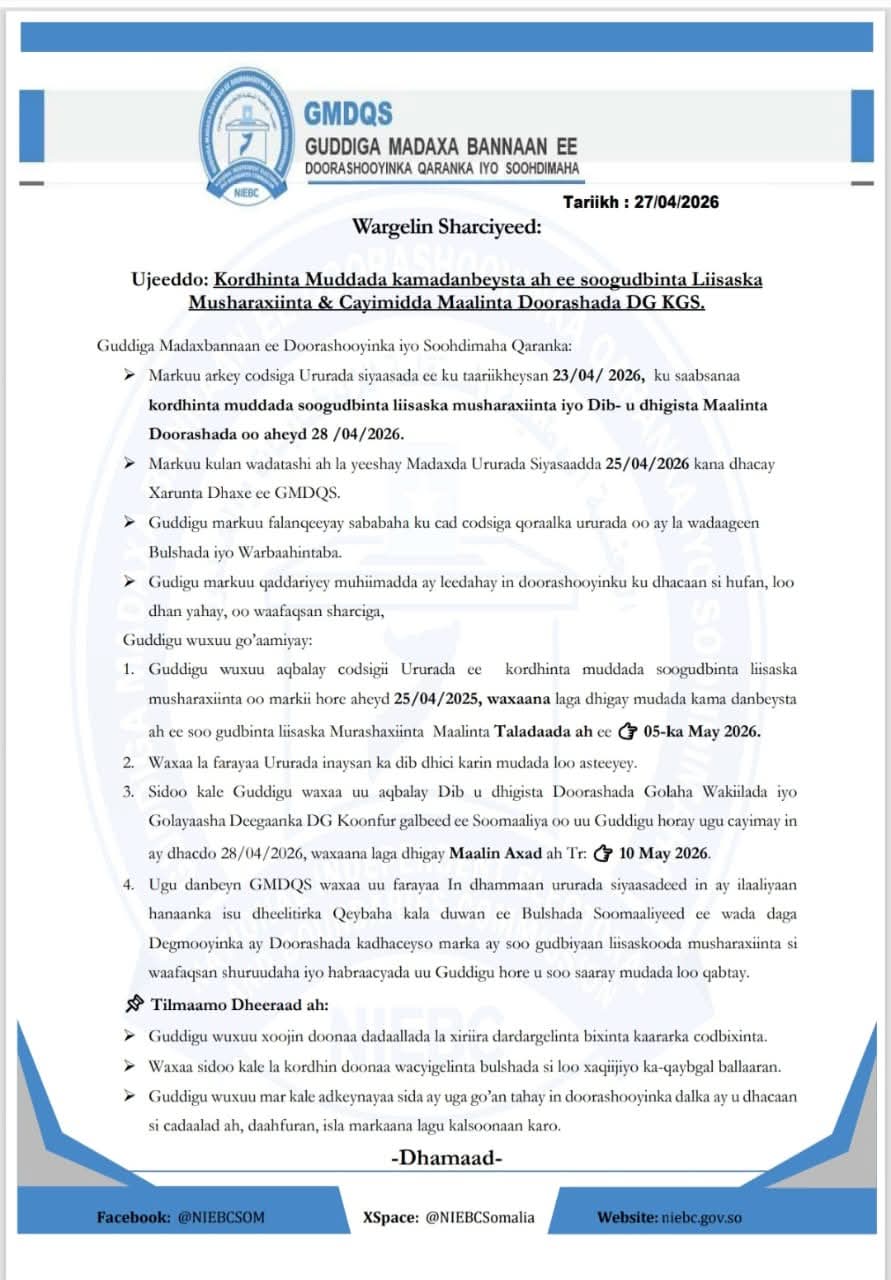 Guddiga Doorashooyinka Qaranka iyo Soohdimaha ayaa soo saaray war-saxaafadeed ku saabsan kordhinta muddada kama-dambeysta ah ee soo gudbinta liisaska musharaxiinta...