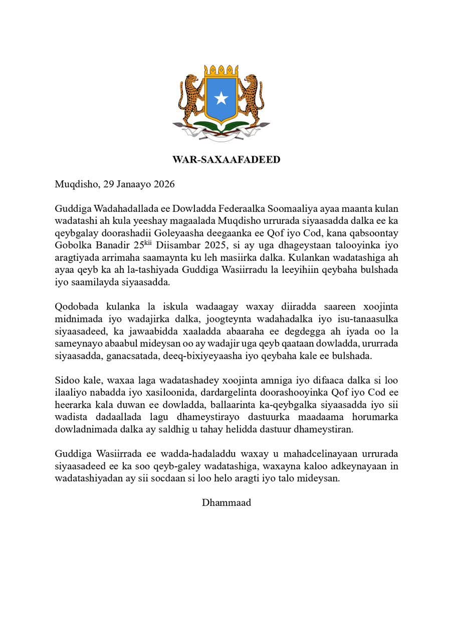 Guddiga Xukuumadda iyo Ururrada Siyaasadda ee ka qeyb qaatay doorashada goleyaasha deegaanka ee Qof iyo Cod ayaa kulankooda maanta ka soo saaray War-saxaafadeed ay uga hadlayaan qodobada ay shirkooda kaga hadleen.
