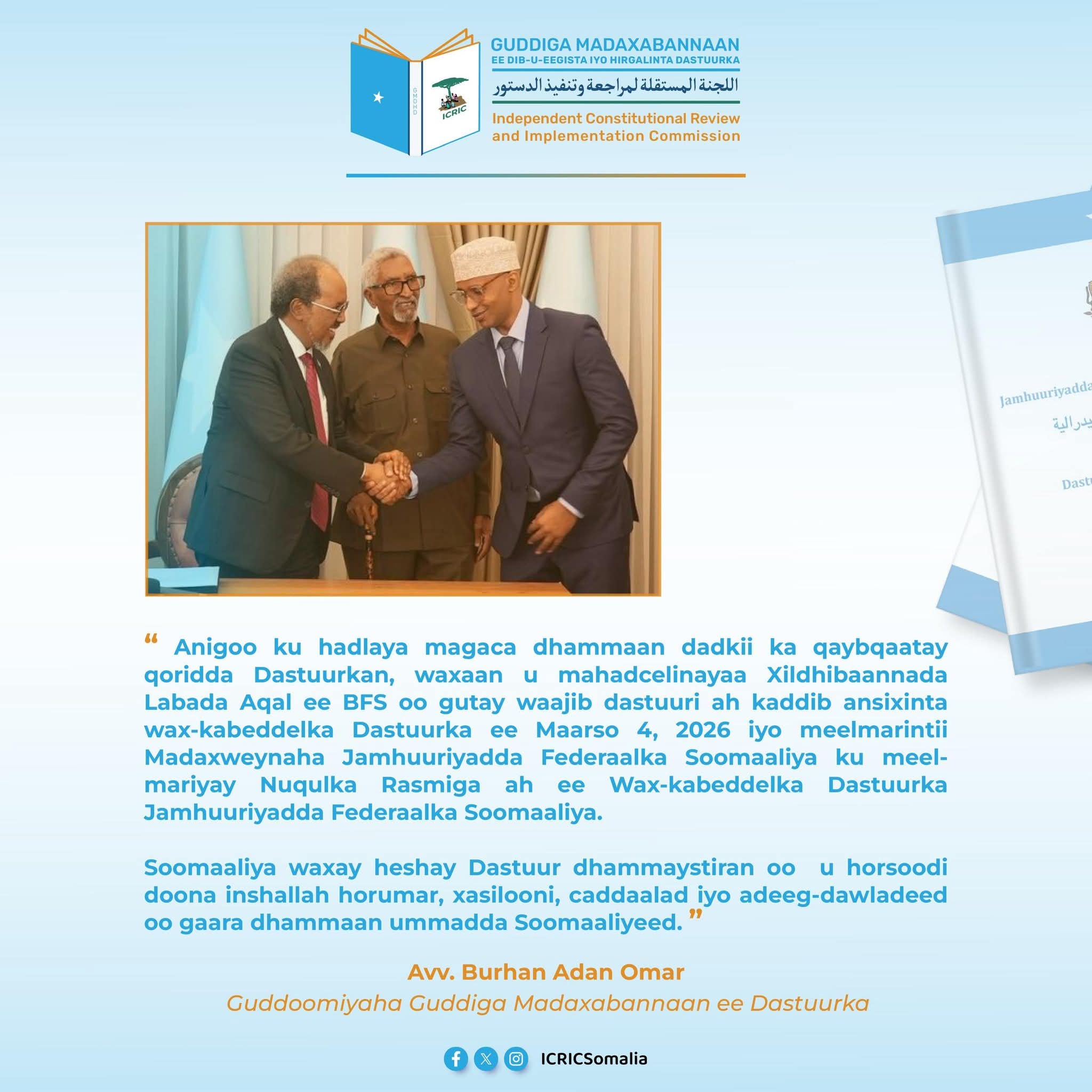 Guddoomiyaha Gudigga Madaxa banaan ee Dastuurka Burhaan Aadan Cumar ayaa Baarlamaanka Dalka uga mahadceliyey inay guteen waajib dastuuri ah, kadib markii ay ansixiyeen dastuurka.