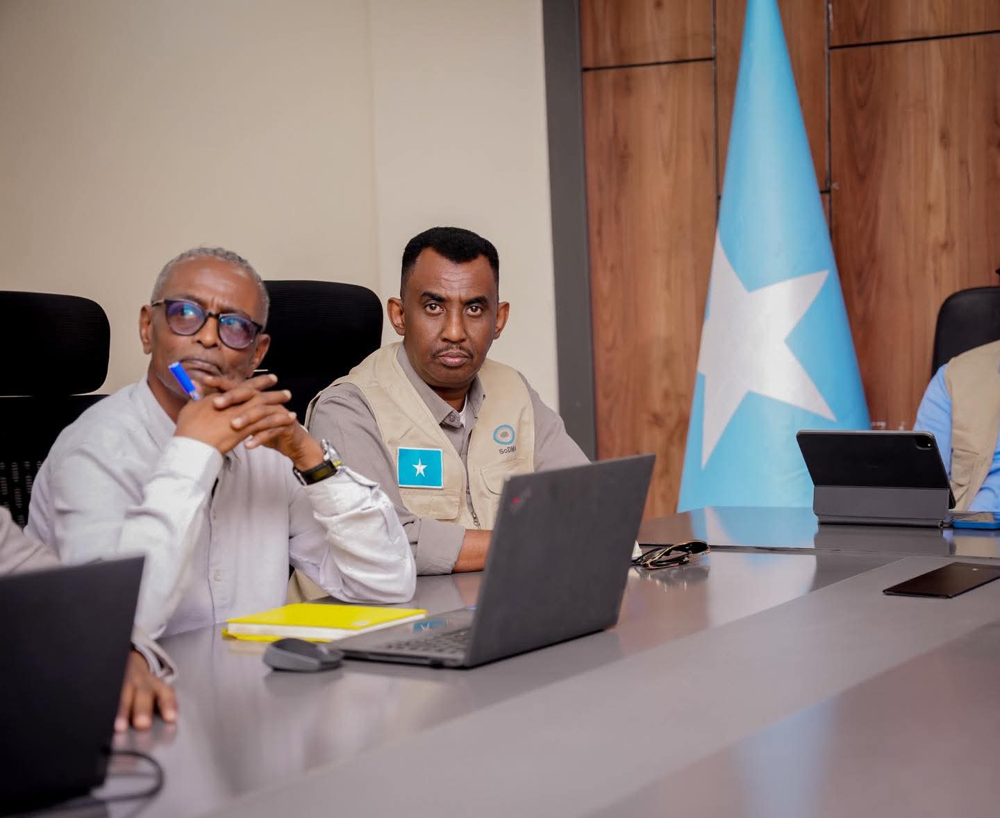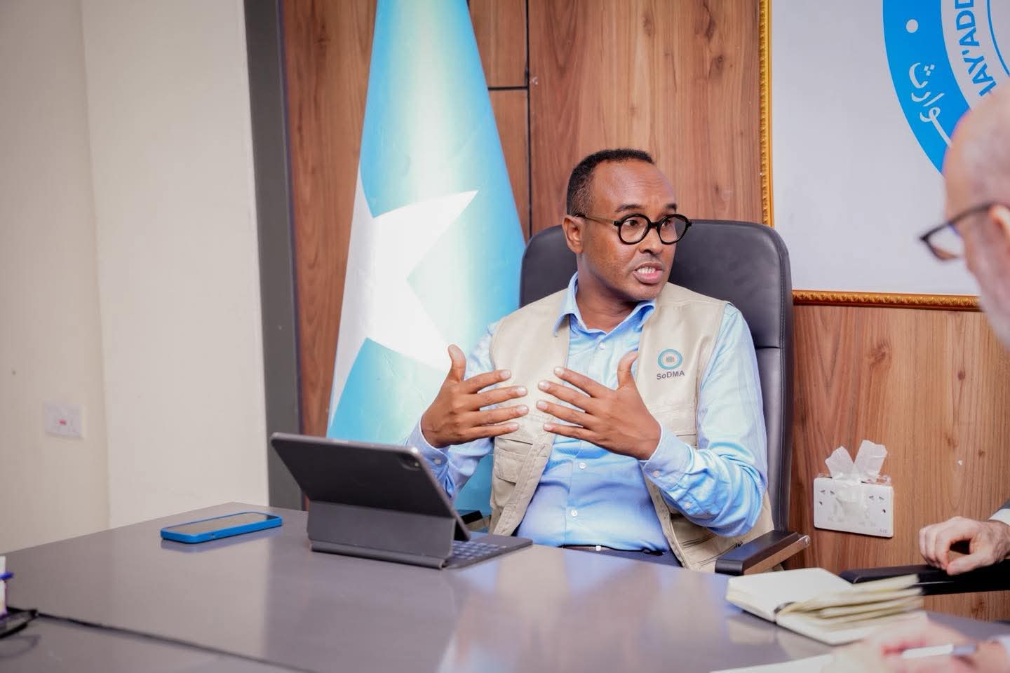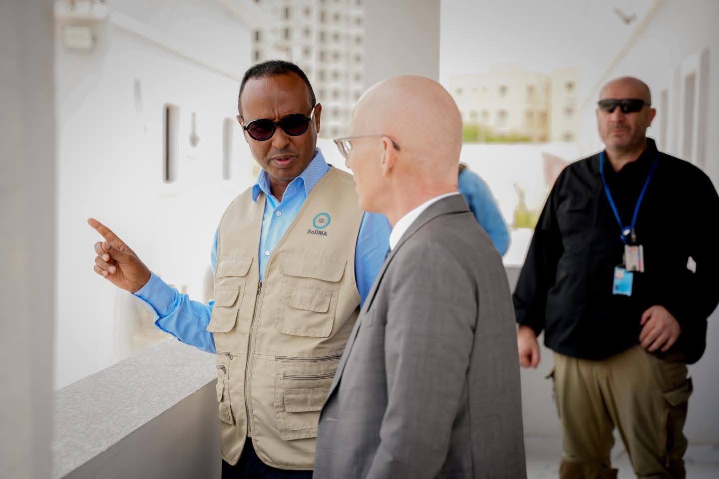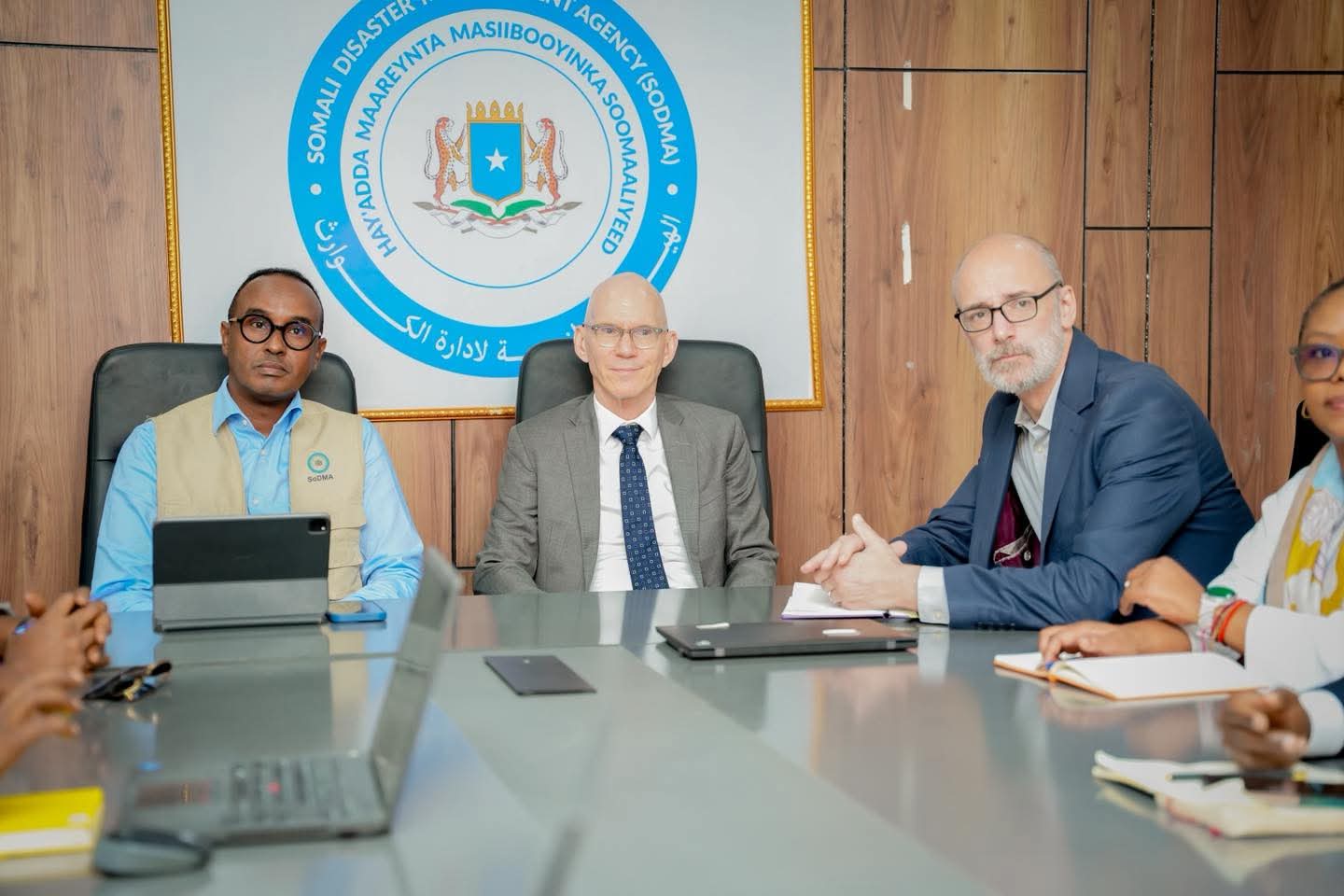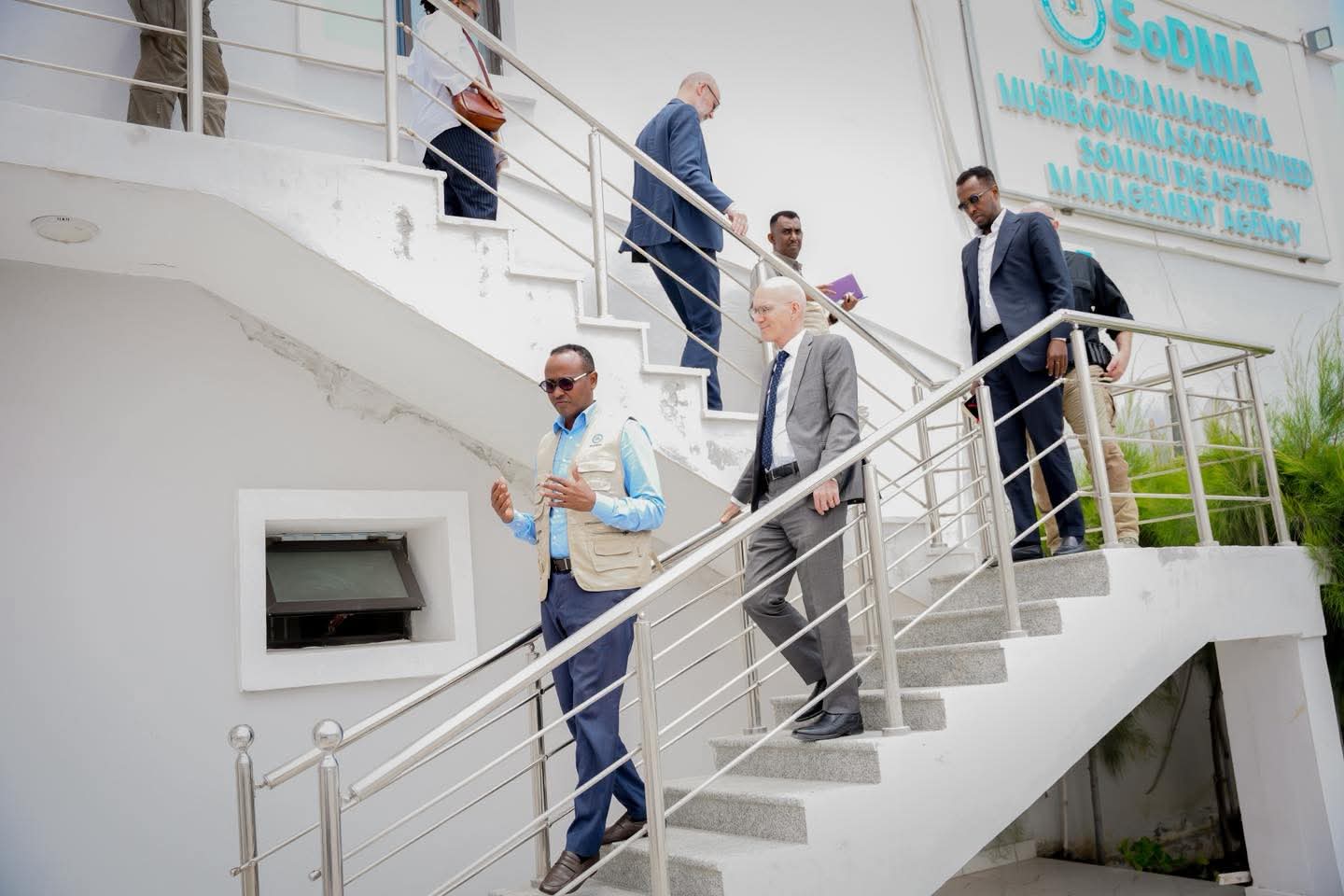 Guddoomiyaha Hay’adda Maareynta Musiibooyinka Qaranka SoDMA, Mudane Maxamuud Macalin Cabdulle, ayaa xarunta hay’adda ku qaabilay Wakiilka Xoghayaha Guud ee Qaramada Midoobay u qaabilsan Soomaaliya James Swan iyo Ku-xigeenka Ergayga Gaarka ah ee Xoghayaha Guud ee Qaramada Midoobay, ahna Isku-duwaha Howlaha Qaramada Midoobay ee Soomaaliya ee Horumarinta iyo Arrimaha Beni’aadannimada, Mr. George Conway.