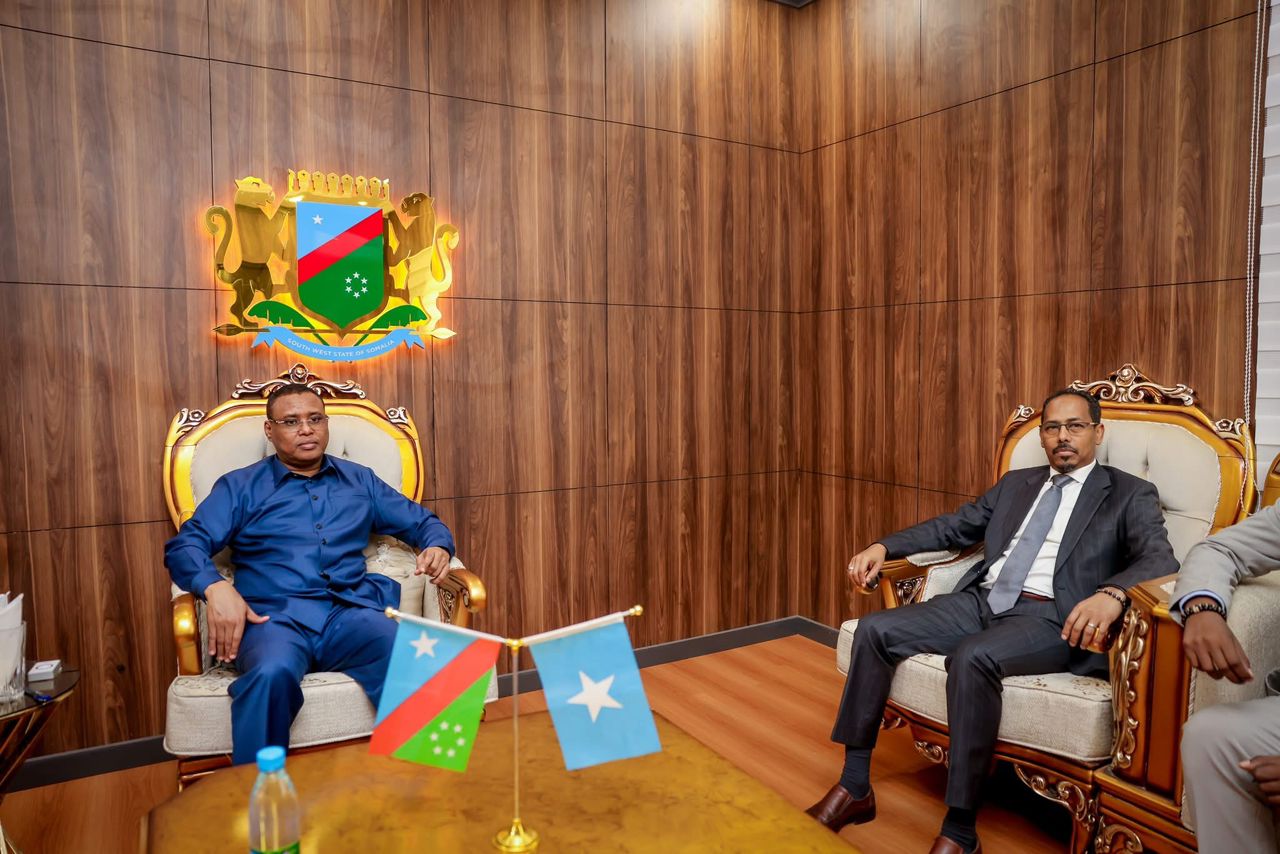 HOGAAMIYE JIBRIIL CABDIRASHIID Xaaji Baydhabo Abriil, 28, 2026: Hoggaamiyaha ku meel gaarka ah ee Dowladda Koonfur Galbeed Soomaaliya Mudane Jibriil Cabdirashiid Xaaji ayaa Aqalka Madaxtooyada ee Magaalada Baydhabo ku qaabilay Musharax Madaxweyne Dowladda Koonfur Galbeed Mudane Cabdicasiis Maxamed Sheekh Cusmaan (Jawaari).