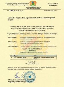 RADIO MUQDISHO(BAYDHABA):Hoggaamiyaha Ku-meel-gaarka ah ee Koonfur Galbeed Mudane Jabriil Cabdirashiid Xaaji, ayaa Cali Cabdulaahi Isaaq u-magacaabay Agaasimaha Guud ee Madaxtooyada Dowlad Goboleedka Koonfur Galbeed.