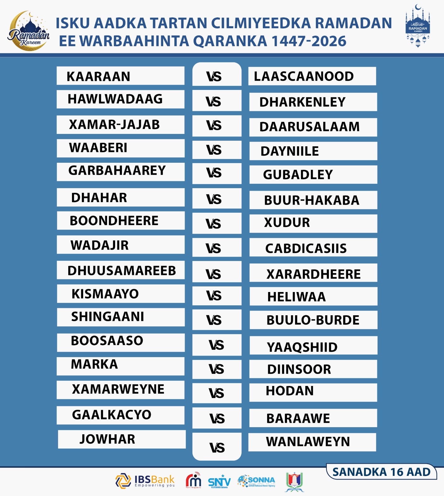Akhriatayaasheena sharafta leh waxaan halkan idinkugu soo gudbineynaa Isku aadka Tartan Cilmiyeedka Ramadan Warbaahinta Qaranka ee degmooyinka iyo gobollada Dalkeenna.