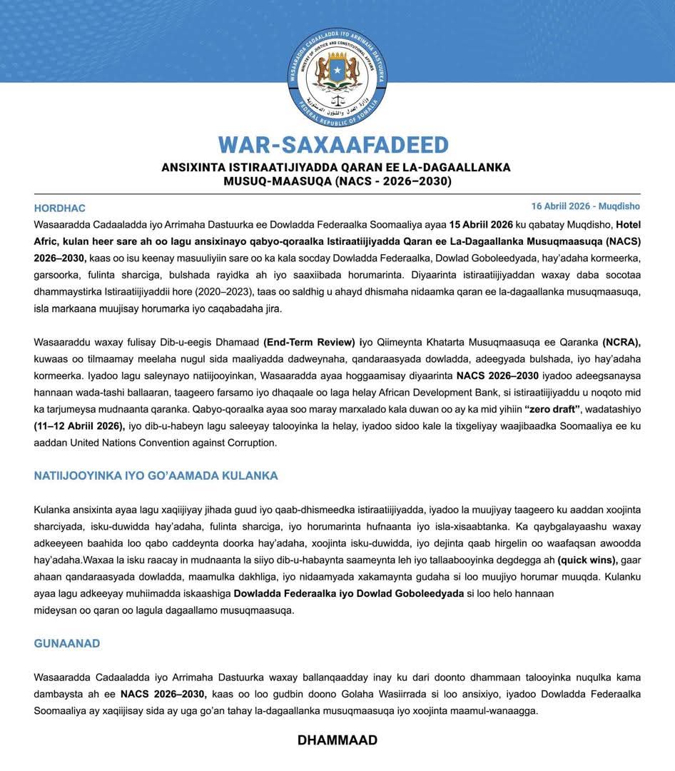 War-saxaafadeed: Ansixinta Istiraatiijiyadda Qaran ee La-dagaallanka musuqmaasuqa (NACS – 2026–2030).