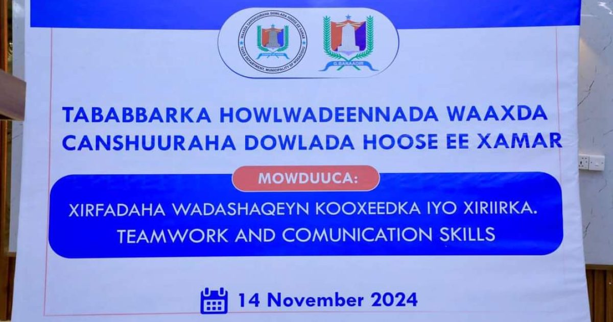 Ku-Simaha Duqa Muqdisho ahna Guddoomiye Kuxigeenka Maamulka iyo Maaliyadda Gobolka Banaadir Mudane Ciise Maxamuud Guure, ayaa daah-furay Tababar loo qabanaayo Howlwadeenada Waaxda Canshuuraha Dowladda Hoose ee Xamar, kaasi oo lagu baranaayo Xirfadaha wadashaqeyn kooxeedka iyo xiriirka.