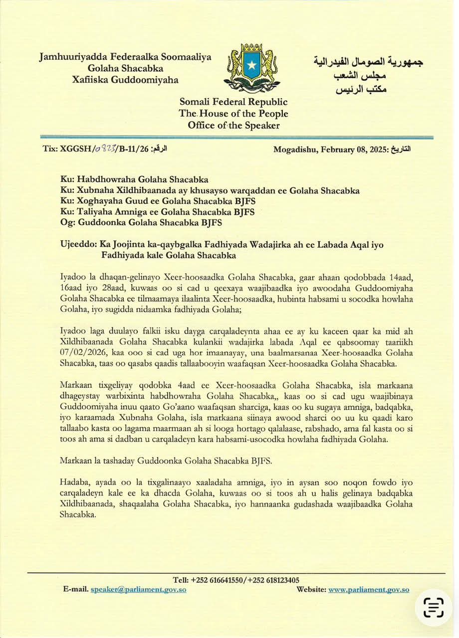 Ku-simaha Guddoomiyaha ahna Guddoomiye kuxigeenka labaad ee Golaha Shacabka Baarlamaanka Jamhuuriyadda Federaalka Soomaaliya Mudane Cabdullaahi Cumar Abshirow ayaa soo saaray go’aan rasmi ah oo la xiriira ka joojinta fadhiyada guud ee wadajirka ah ee labada Aqal ee Baarlamaanka Dalka iyo sidoo kale fadhiyada Golaha Shacabka, kaddib qalalaasihii ka dhacay fadhigii wadajirka ahaa ee labada Aqal, kaas oo qabsoomay 7-dii Febraayo, 2026.