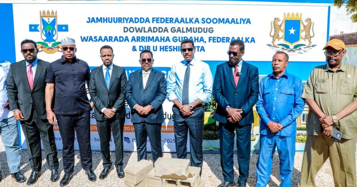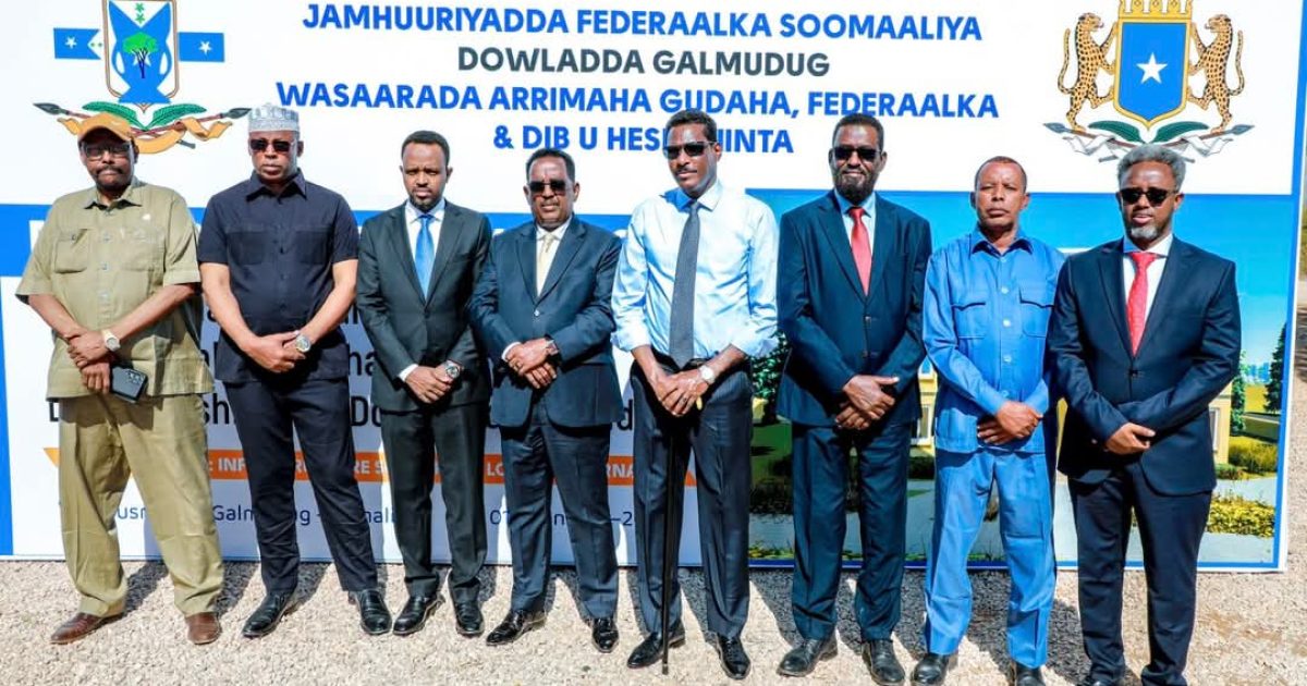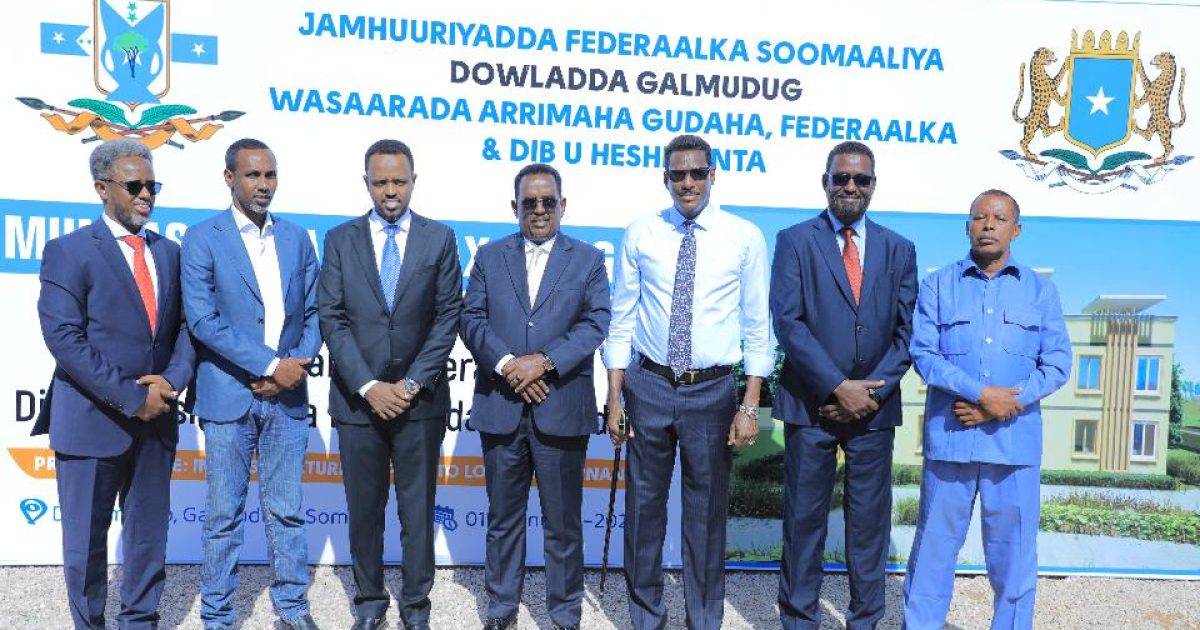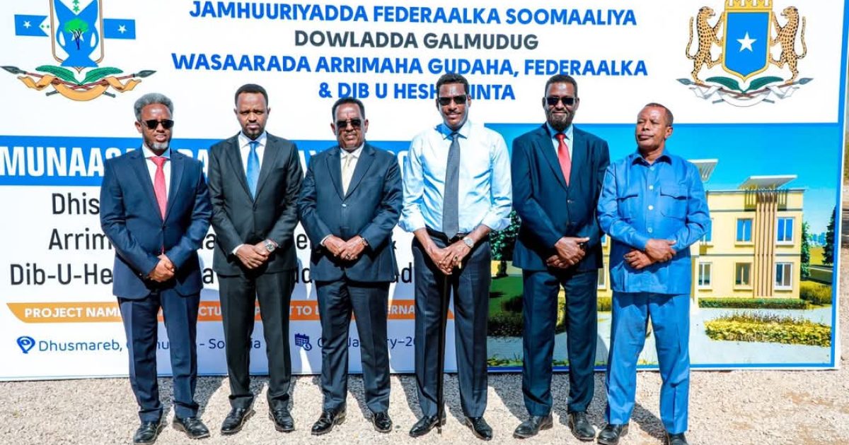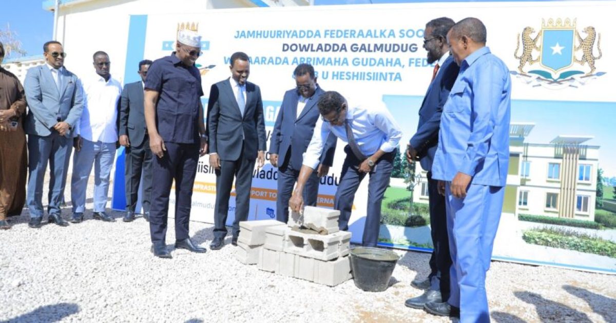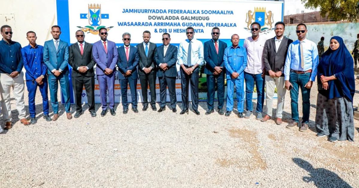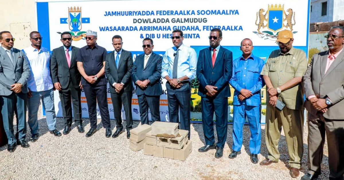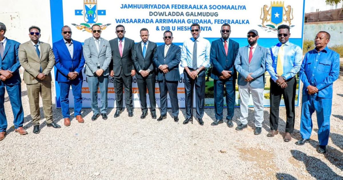 Madaxweynaha Dowlad Gobolleedka Galmudug Mudane Axmed Cabdi Kaariye oo uu wehliyo Wasiirka Arrimaha Gudaha, Federaalka iyo Dib u heshiisiinta Xukuumaadda Federaalka Soomaaliya mudane Hon Ali Yusuf Ali – Xoosh, ayaa dhagax dhigay Dhismaha Xarunta Wasaaradda Arrimaha Gudaha Galmudug.