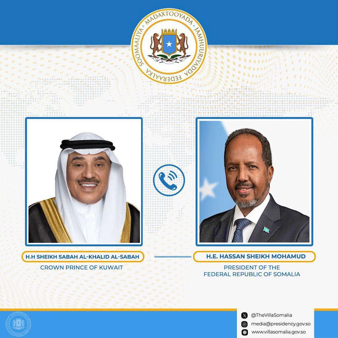 Madaxweynaha Jamhuuriyadda Federaalka Soomaaliya Mudane Xasan Sheekh Maxamuud ayaa dhanka telefoonka kula hadlay Dhaxal-sugaha Dowladda aan walaalaha nahay ee Kuwayt Sheekh Sabaax Khaalid Al-Xamad Al-Sabaax oo ay ka wadahadleen xaaladaha Gobolka.