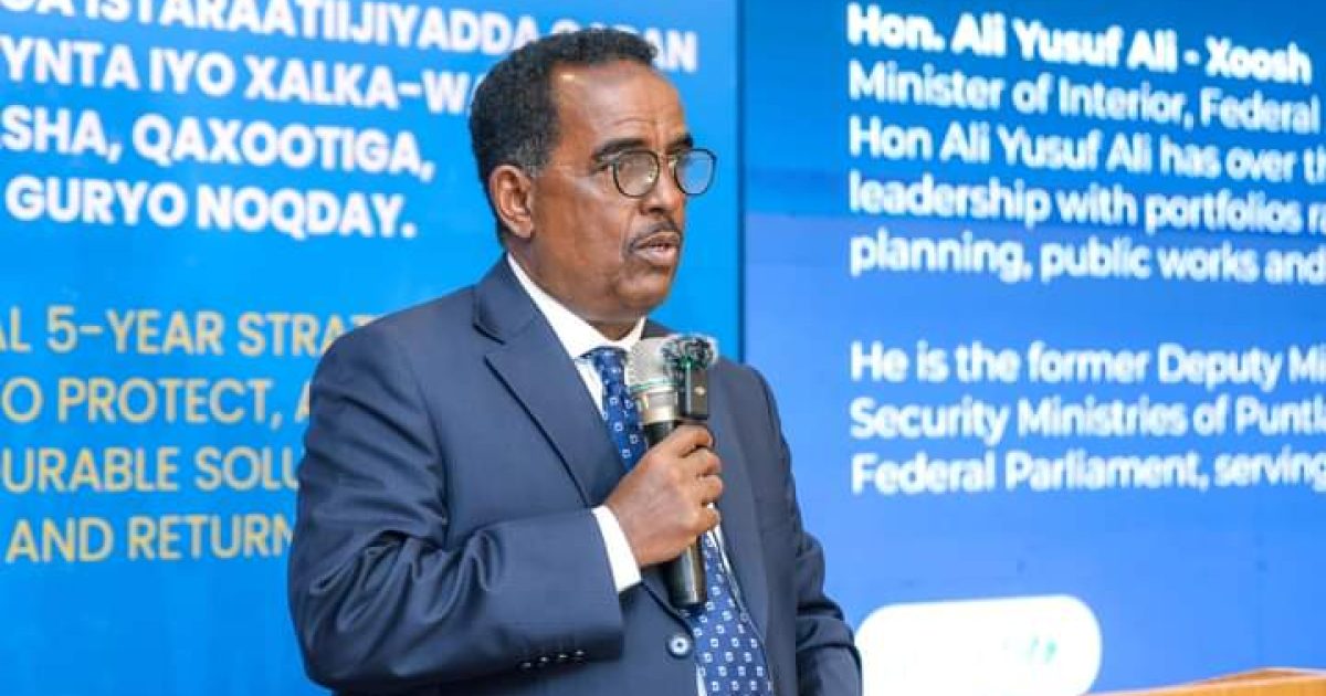 Wasiirka Arrimaha Gudaha, Federaalka iyo Dib u heshiisiinta XFS mudane CaliYuusufCali- Xoosh ayaa maanta kaqeybgalay Daahfurka wadatashiga Istaraatiijiyadda Qaran ee Ilaalinta, Taakuleynta iyo Xalka Waara ee Barakacayaasha, Qaxootiga iyo Dadka Soo Gurya Noqday.