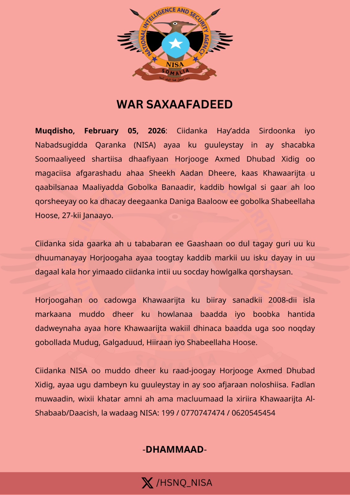 Ciidanka NISA oo muddo dheer ku raad-joogay Horjooge Axmed Dhubad Xidig, ayaa ugu dambeyn ku guuleystay in ay soo afjaraan noloshiisa. Fadlan muwaadin, wixii khatar amni ah ama macluumaad la xiriira Khawaarijta Al-Shabaab/Daacish, la wadaag NISA: 199 / 0770747474 / 0620545454