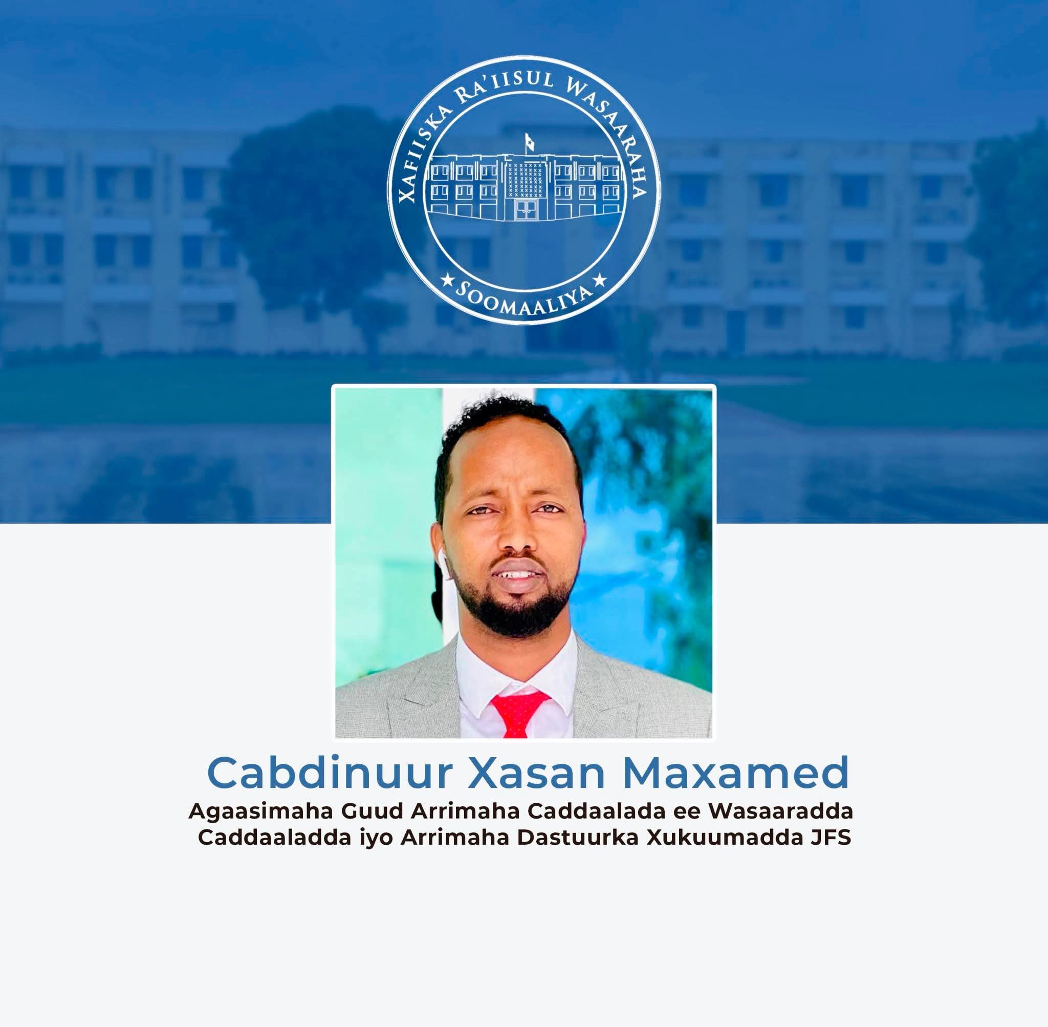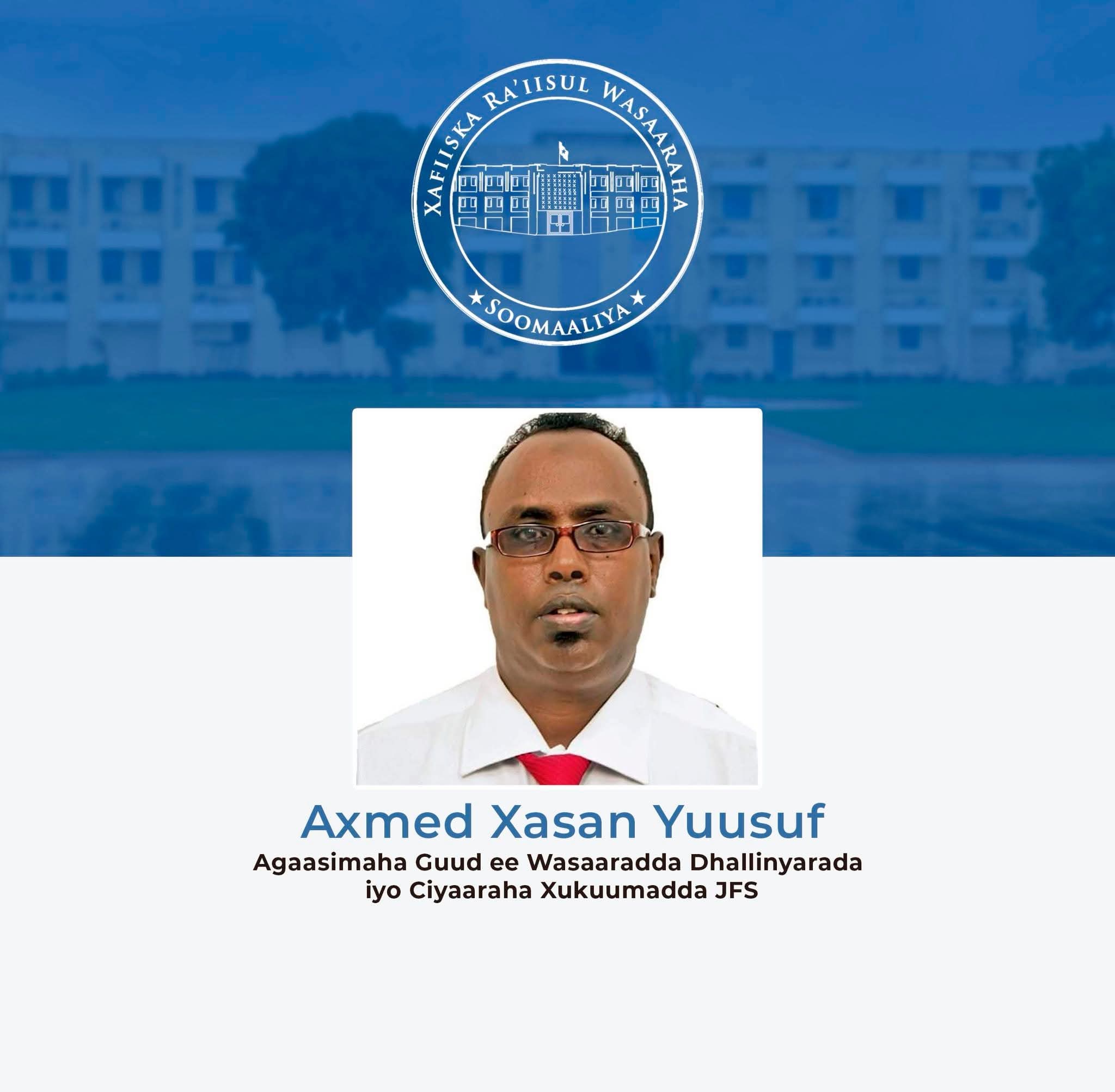 Ra’iisul Wasaaraha Xukuumadda Jamhuuriyadda Federaalka Soomaaliya Mudane Xamsa Cabdi Barre ayaa Agaasimaha Guud ee Wasaaradda Dhallinyarada iyo Ciyaaraha Xukuumadda JFS u magacaabay Mudane Axmed Xasan Yuusuf , halka Agaasimaha Guud Arrimaha Cadaaladda ee Wasaaradda Cadaaladda iyo Arrimaha Dastuurka Xukuumadda JFS oo uu u magacaabay Cabdinuur Xasan Maxamed .