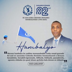 RADIO MUQDISHO:-Ra’iisul Wasaaraha Xukuumadda Jamhuuriyadda Federaalka Soomaaliya, Mudane Xamsa Cabdi Barre, ayaa hambalyo u diray Ciidanka Booliska Soomaaliyeed munaasabadda 82-guurada aas-aaska ciidanka.