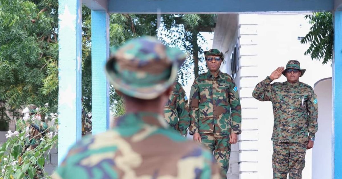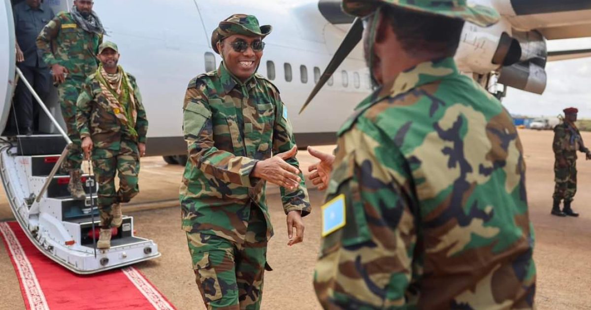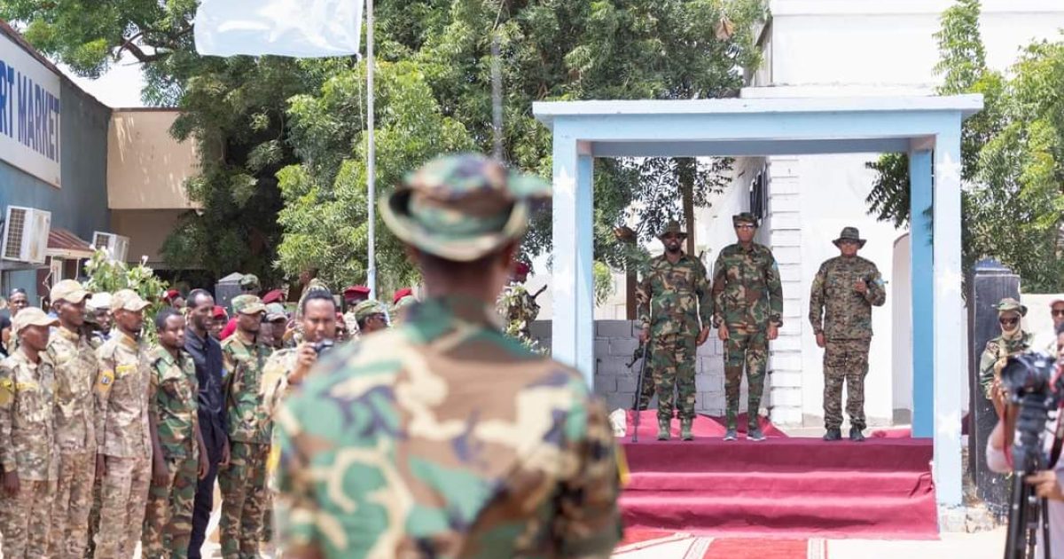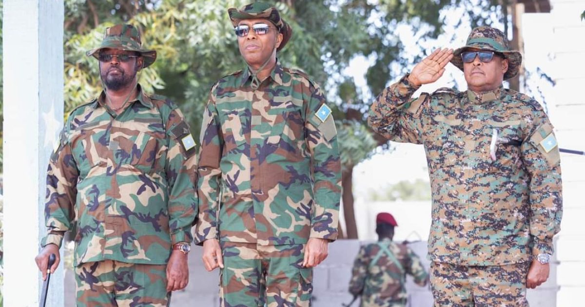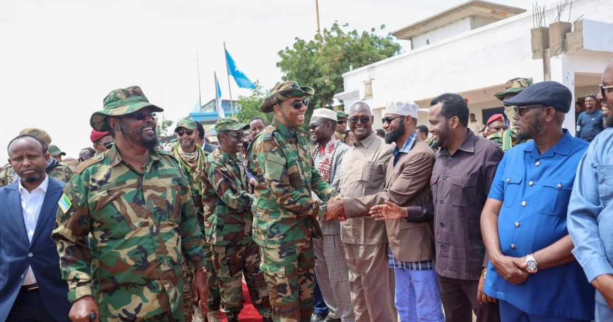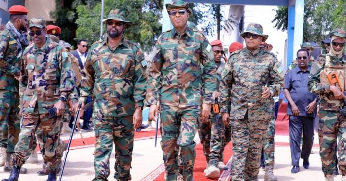 Mudane Xamsa Cabdi Barre oo xiran dharka Ciidanka ayaa halkaas u gaaray dhiirogelinta Ciidanka Xoogga Dalka iyo kuwa Jubbaland oo howgallo ka dhan ah Khawaarijta kawada halkaasi.