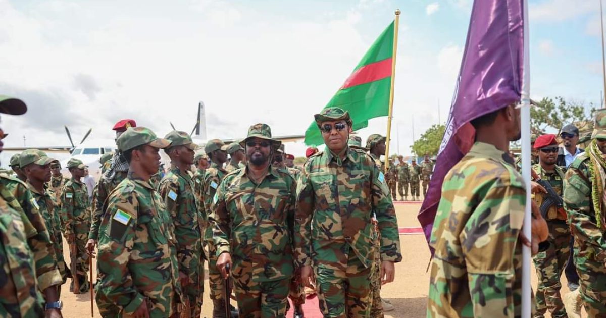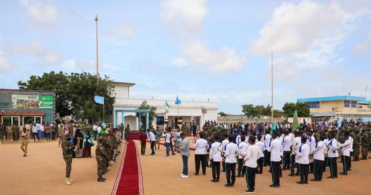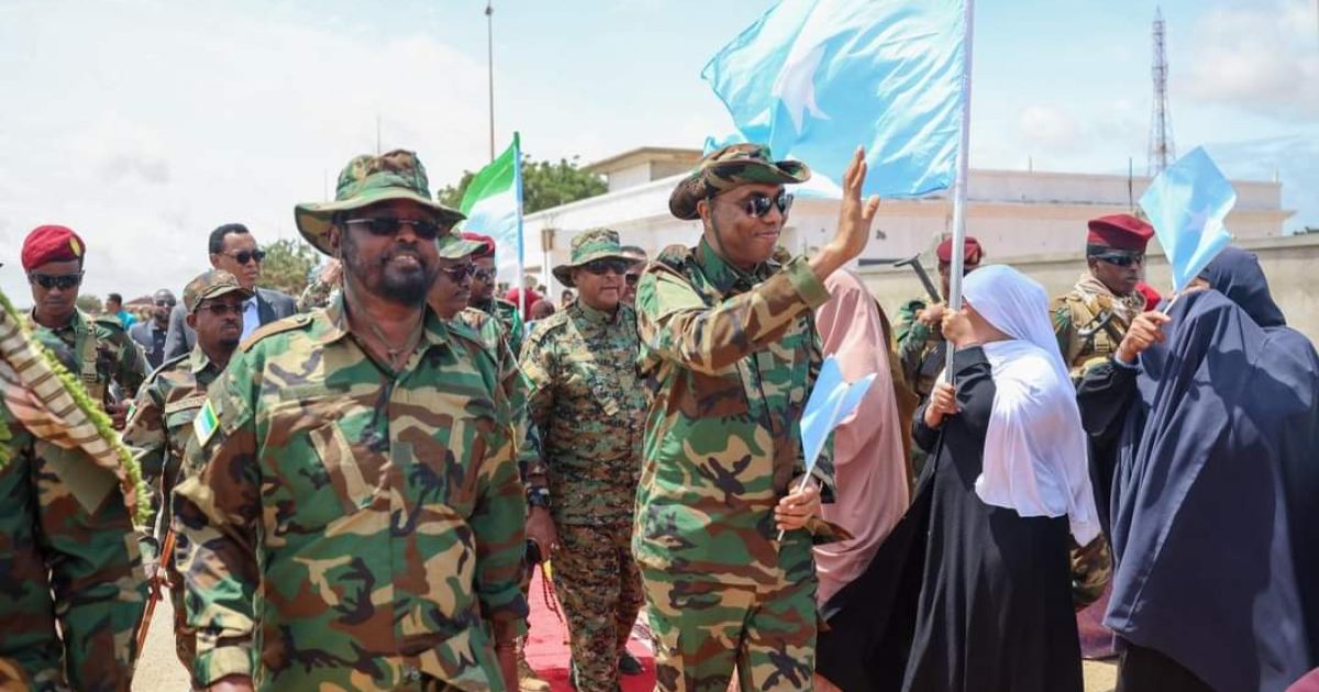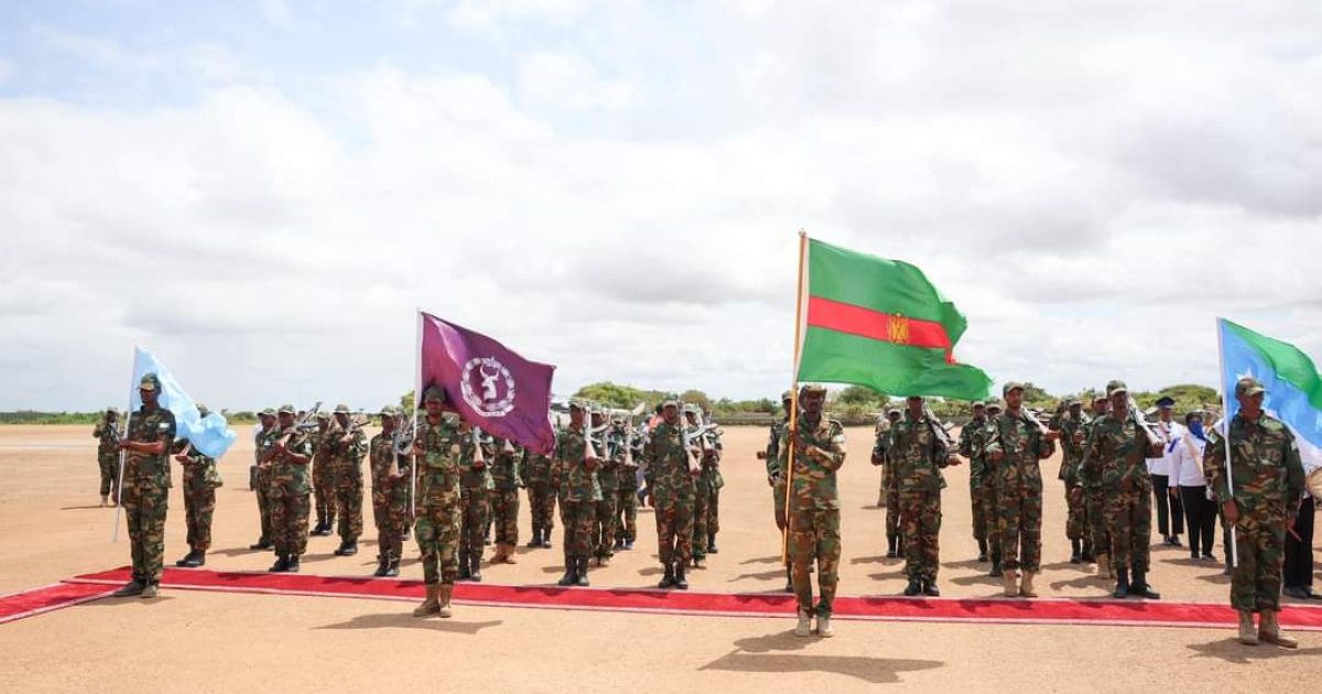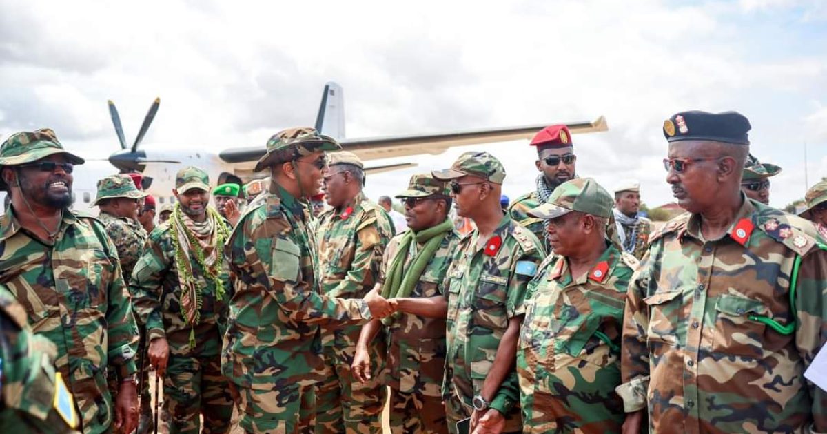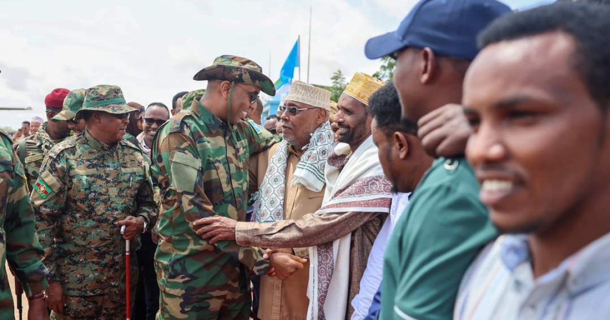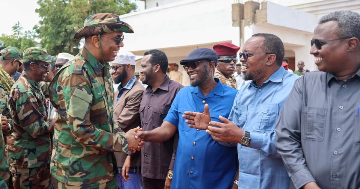 Mudane Xamsa Cabdi Barre oo xiran dharka Ciidanka ayaa halkaas u gaaray dhiirogelinta Ciidanka Xoogga Dalka iyo kuwa Jubbaland oo howgallo ka dhan ah Khawaarijta kawada halkaasi.