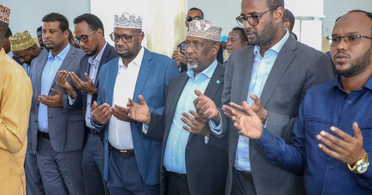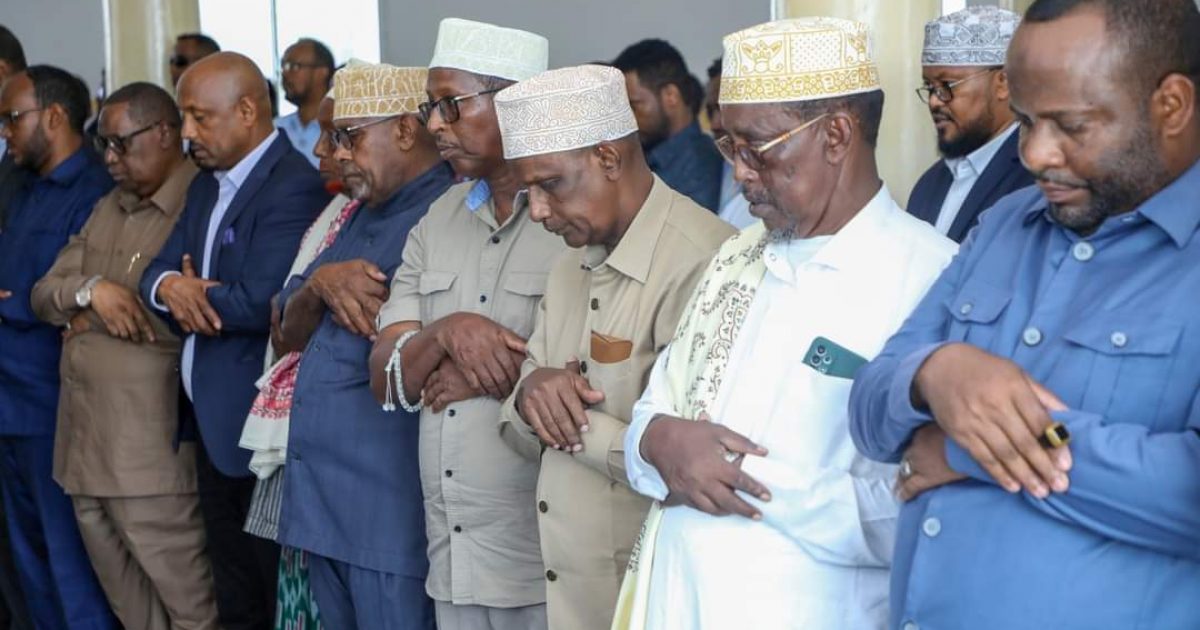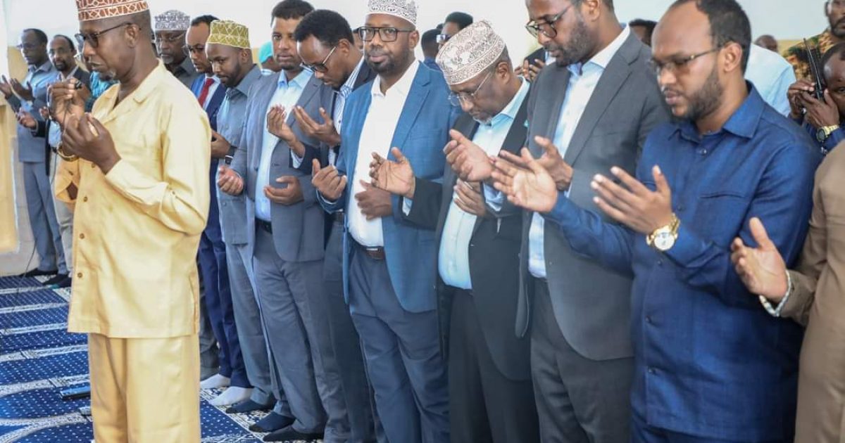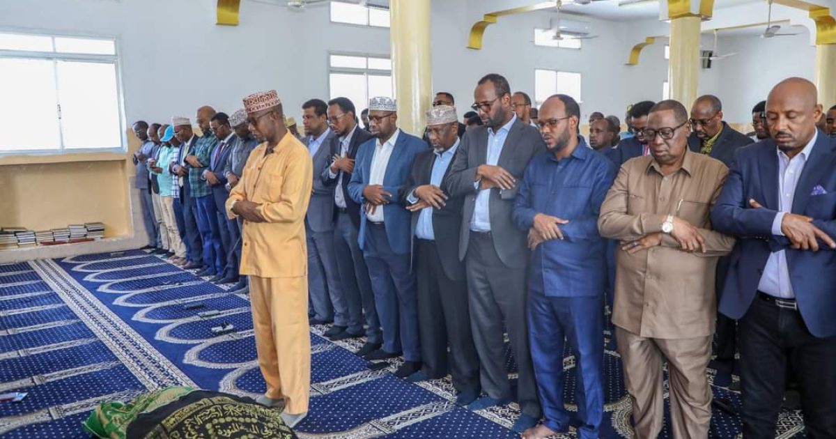 Guddoomiyaha Golaha Shacabka ee Baarlamaanka Jamhuuriyadda Federaalka Soomaaliya ahna Ku-simaha Madaxweynaha Jamhuuriyadda Federaalka Soomaaliya Mudane Sheikh Adan Mohamed Nur Madobe oo ay weheliyaan xildhibaano ka tirsan labada Aqal ee Baarlamaanka Jamhuuriyadda Federaalka Soomaaliya Masaajidka Shuhadada ee Madaxtooyadda Qaranka uga qeyb galay salaada jannaasada Alle ha u naxariistee Marxuum Xildhibaan Maxamuud Maxamed Seeyseey oo ku geeriyooday Muqdisho.