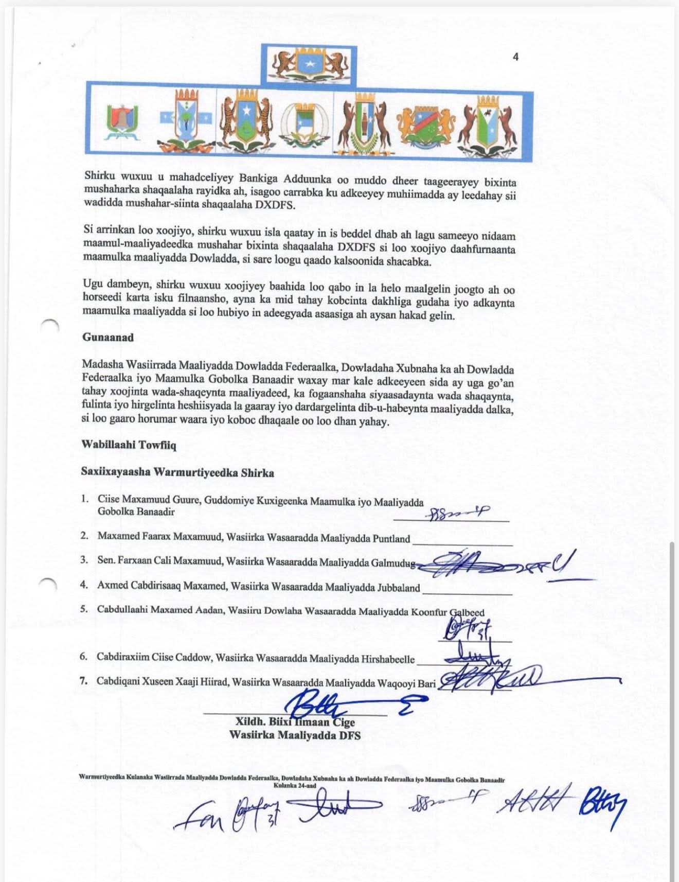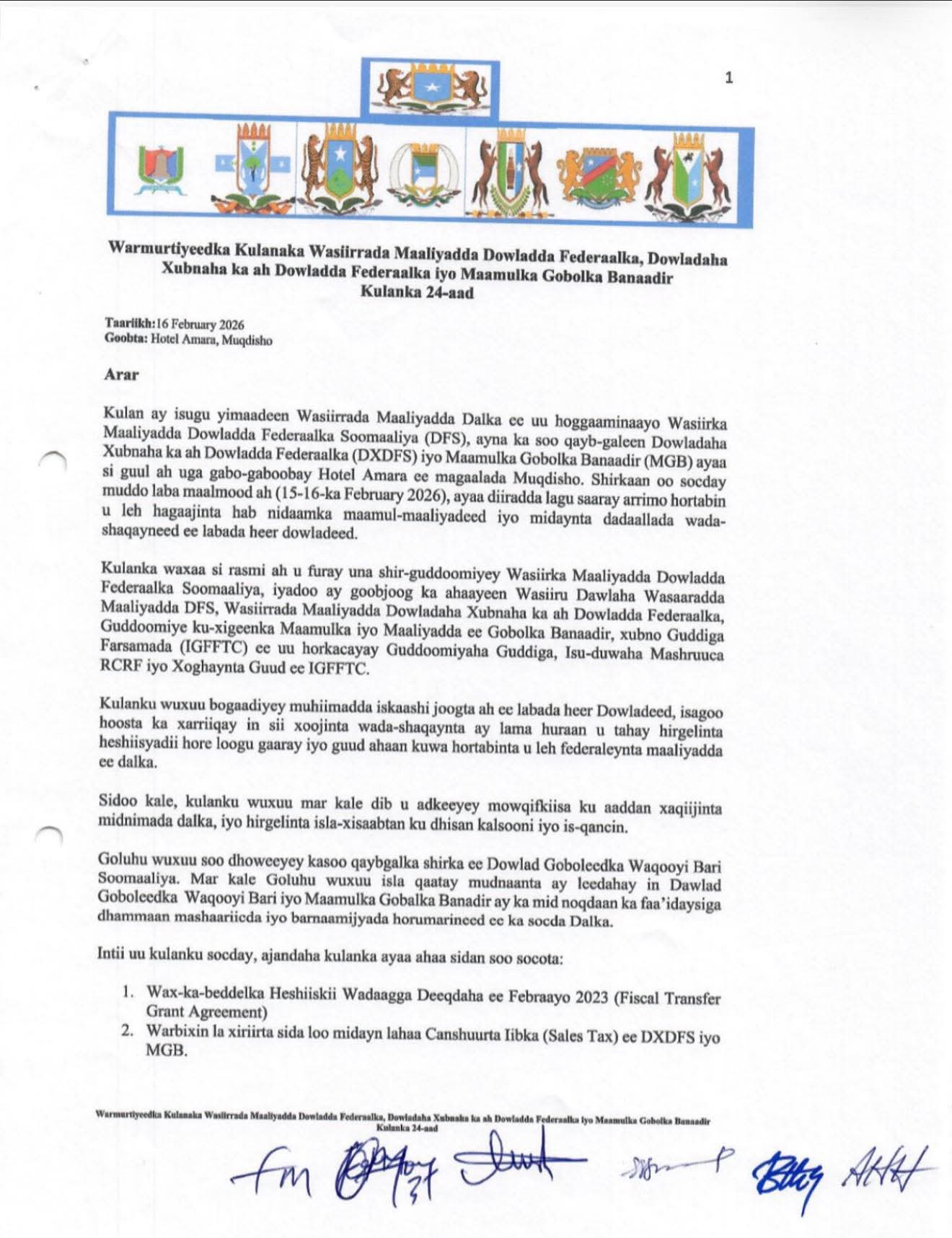 Wasaaradda Maaliyadda XFS ayaa warmurtiyeed ka soo saartay kulankii 24-aad ee Wasiirrada Maaliyadda heer Federaal, heer dowlad-goboleed iyo Maamulka Gobolka Banaadir.