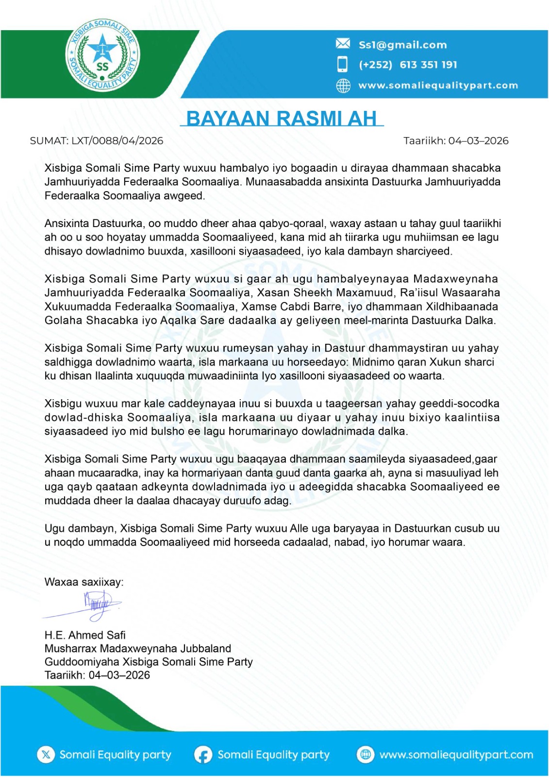 Siyaaasi Axmed Saafi ayaa Madaxda Qaranka uga maahdceliyey dadaalka ay ku bixiyeen dhameystirka Dastuurka Qaranka.