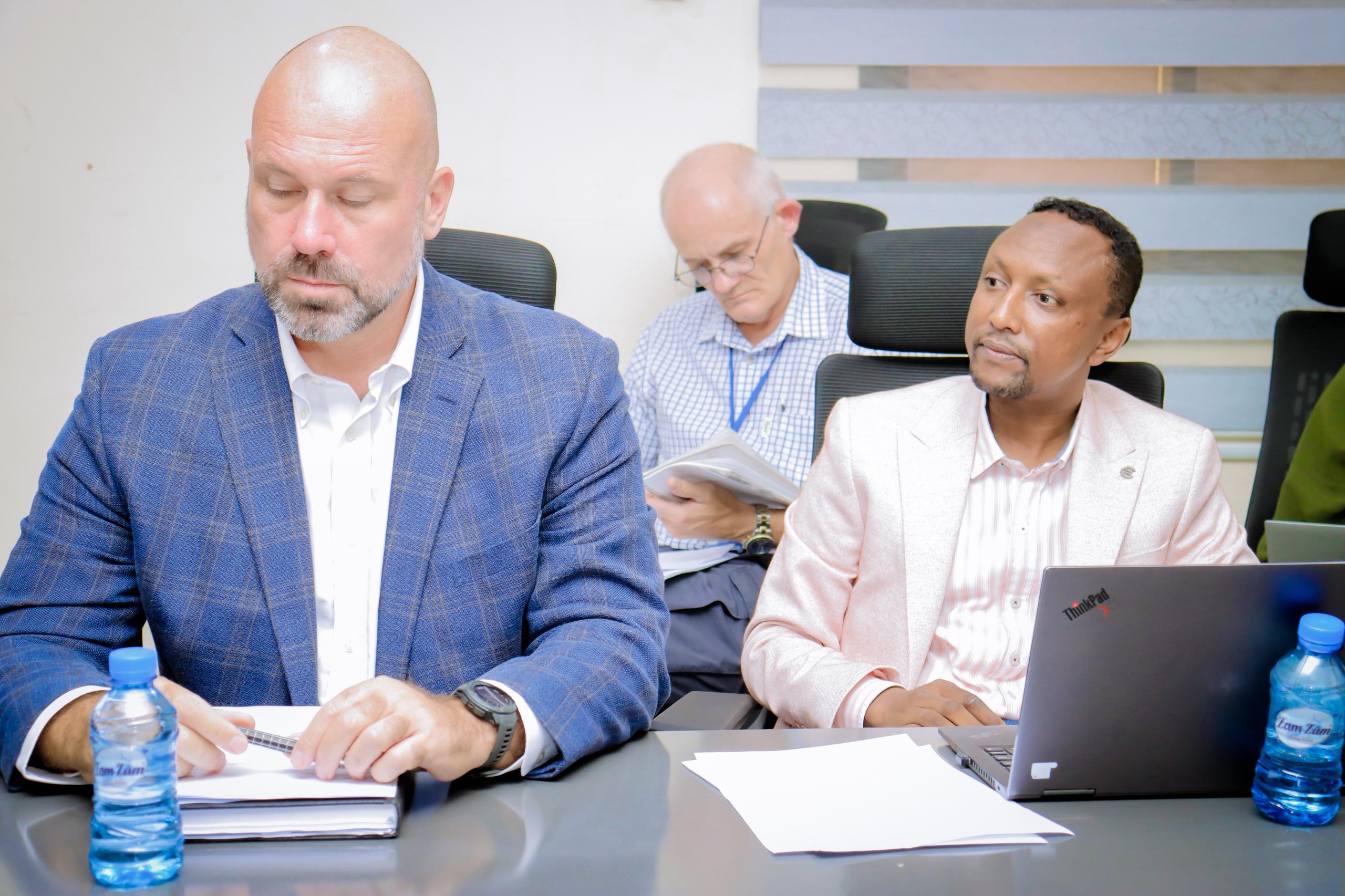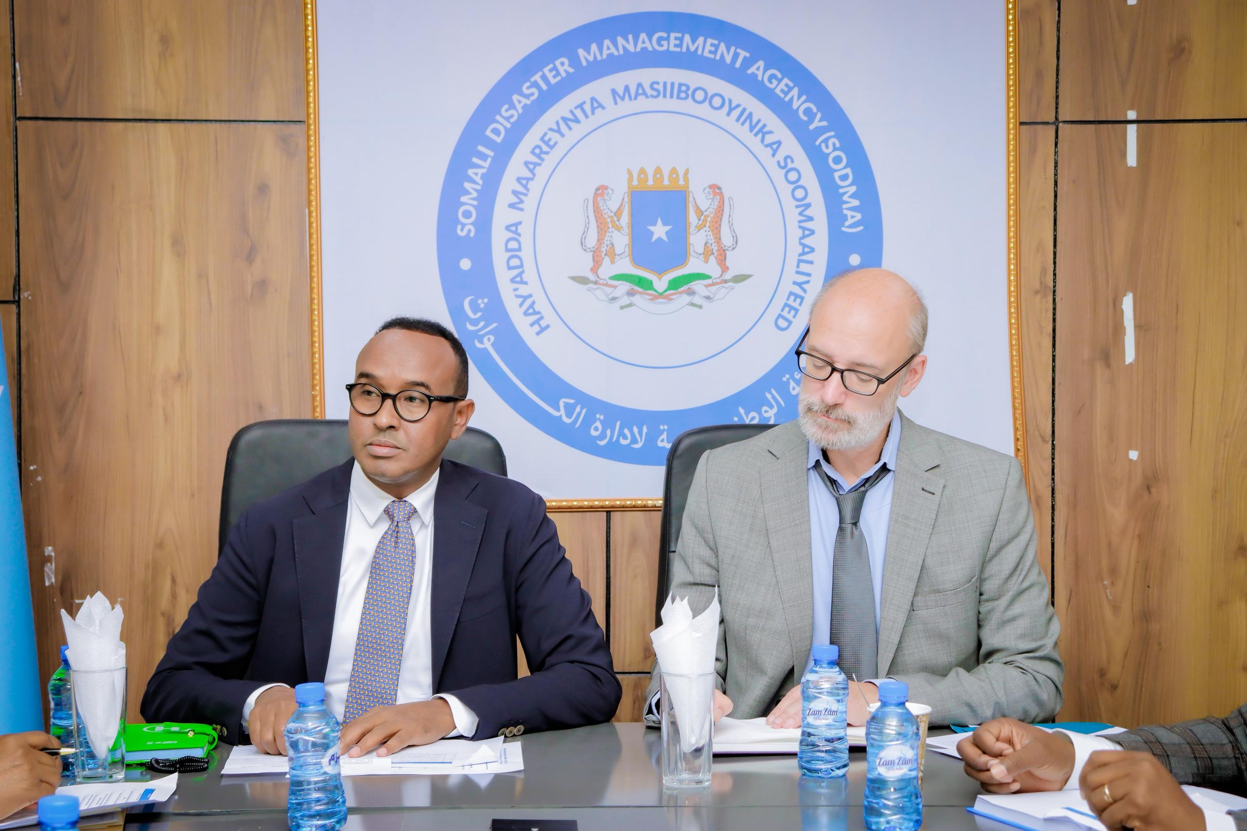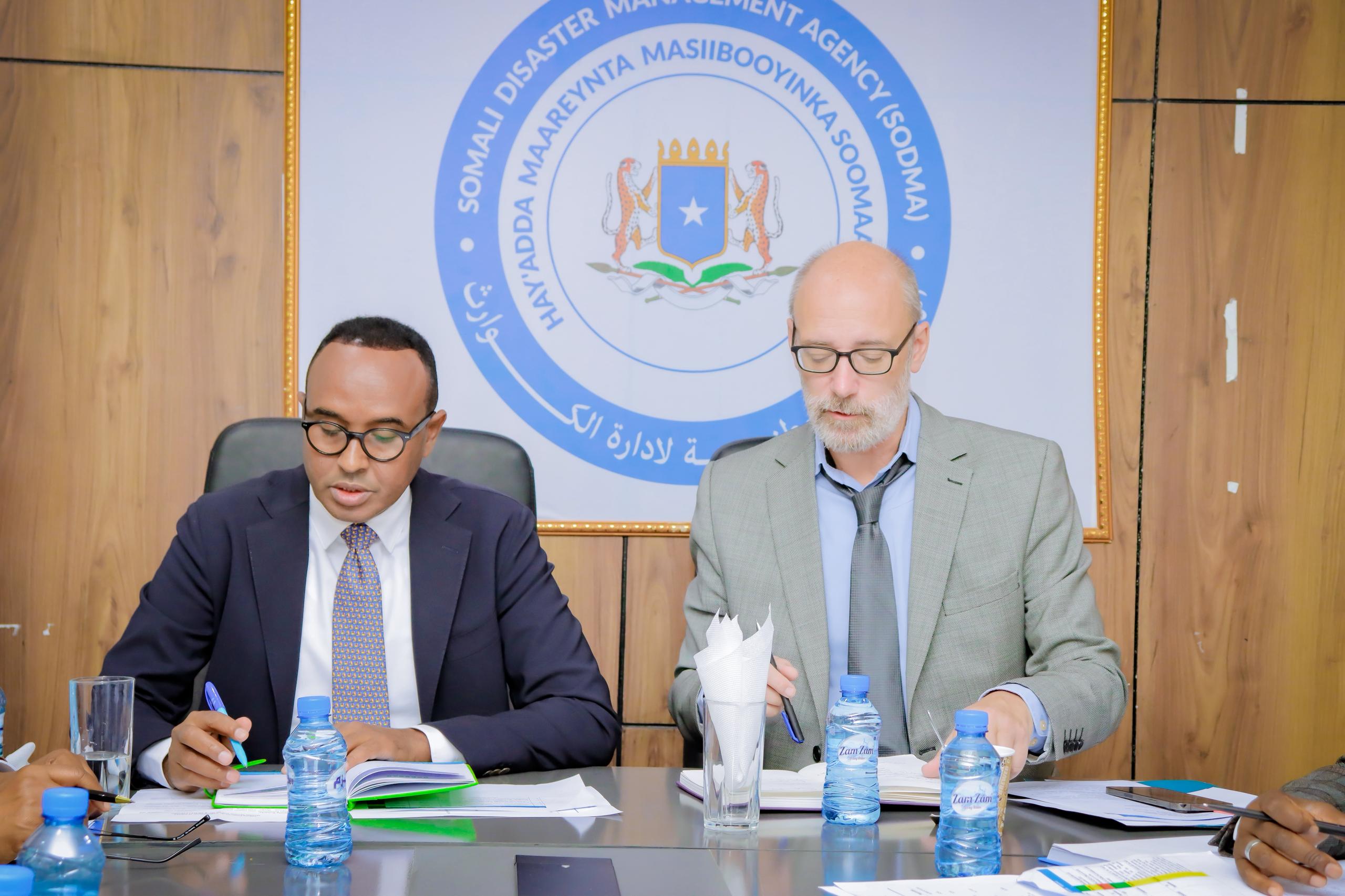 Guddoomiyaha Hay’adda Maareynta Masiibooyinka Qaranka (SoDMA), Maxamuud Macalin Cabdille iyo Madaxa Isku-duwidda Gar-gaarka Beni’aadannimo ee Soomaaliya, Mr. Georg Conway, ayaa maanta ku yeeshay shirkii billaha ahaa xarunta SoDMA ee Muqdisho.