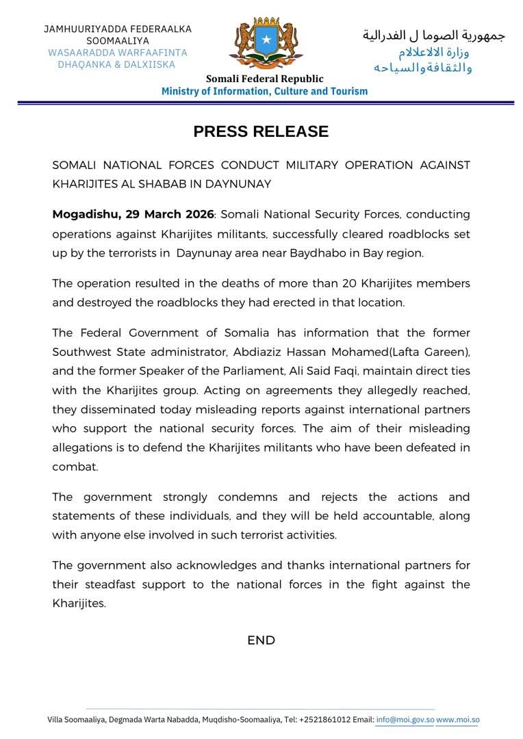 The Federal Government of Somalia has information that the former Southwest State administrator, Abdiaziz Hassan Mohamed(Lafta Gareen), and the former Speaker of the Parliament, Ali Said Faqi, maintain direct ties with the Kharijites group. Acting on agreements they allegedly reached, they disseminated today misleading reports against international partners who support the national security forces. The aim of their misleading allegations is to defend the Kharijites militants who have been defeated in combat.
