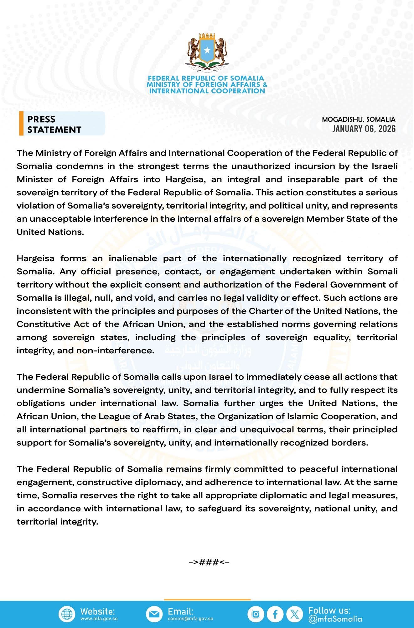 The Ministry of Foreign Affairs and International Cooperation of the Federal Republic of Somalia condemns in the strongest terms the unauthorized incursion by the Israeli Minister of Foreign Affairs into Hargeisa, an integral and inseparable part of the sovereign territory of the Federal Republic of Somalia. This action constitutes a serious violation of Somalia’s sovereignty, territorial integrity, and political unity, and represents an unacceptable interference in the internal affairs of a sovereign Member State of the United Nations.