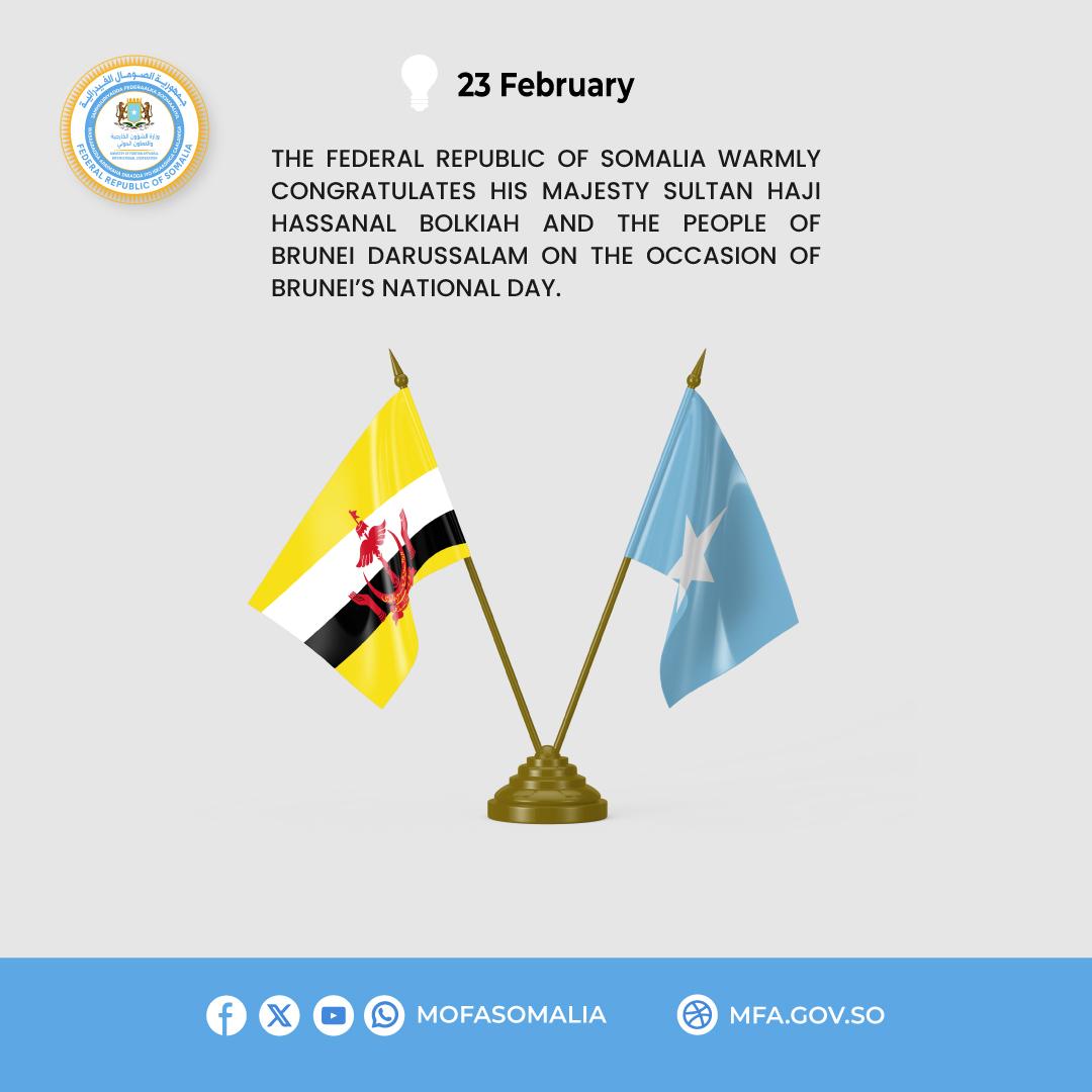 The Federal Republic of Somalia extends its warmest congratulations to His Majesty Sultan Haji Hassanal Bolkiah, the Government, and the people of Brunei Darussalam on the occasion of their National Day.