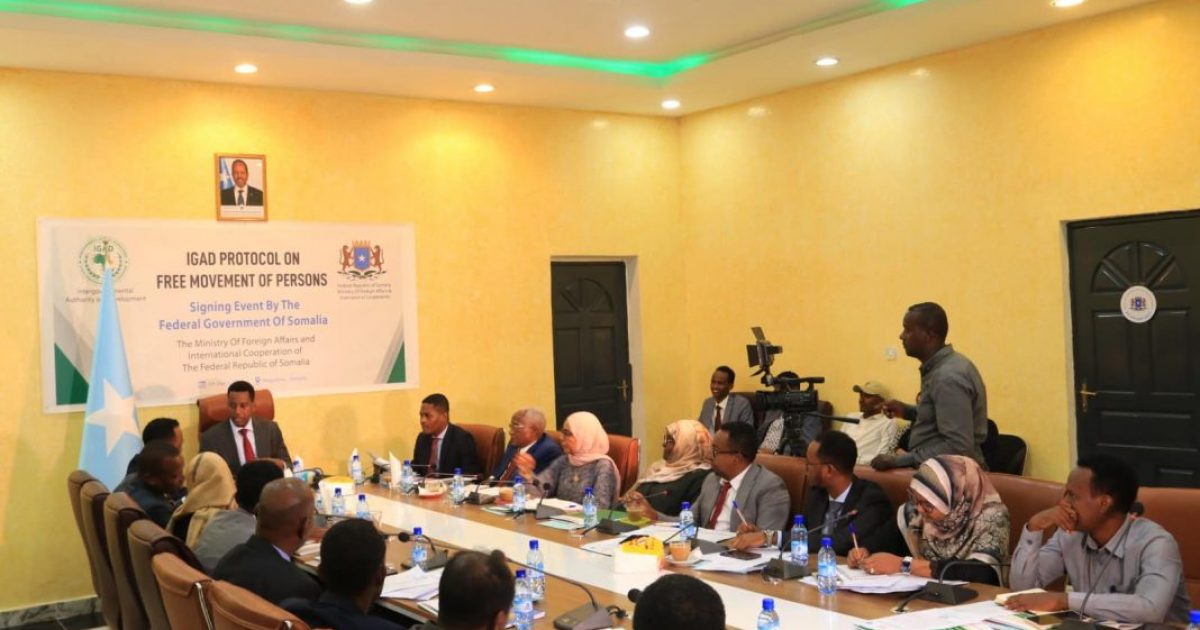 The Deputy Minister of Foreign Affairs and International Cooperation, H.E. Mr. Isaak Mohamud Mursal, officially signed, on Sunday, the Protocol on Free Movement of Persons, on an occasion that was held at the Ministry of Foreign Affairs in the capital, Mogadishu, in which IGAD officials, MPs, senators and senior diplomats were present.