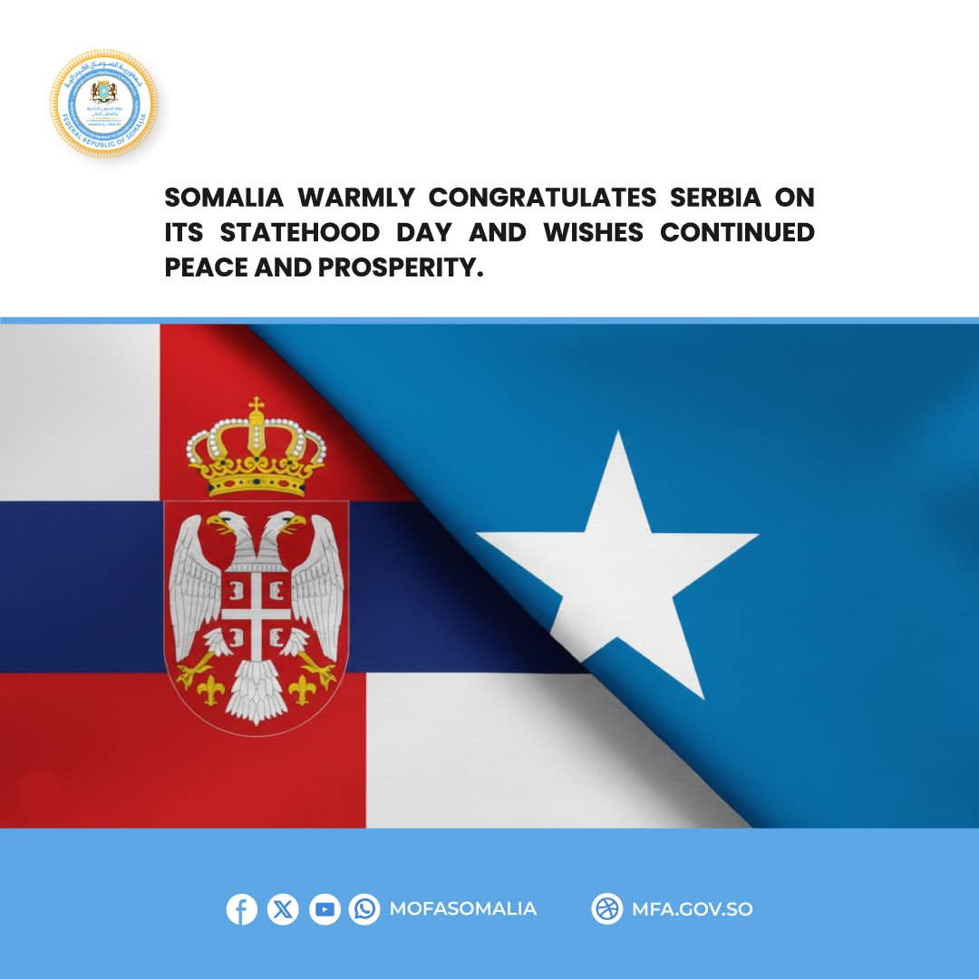 Dowladda Jamhuuriyadda Federaalka Soomaaliya waxay hambalyo iyo bogaadin u diraysaa Dowladda iyo Shacabka Jamhuuriyadda Serbia munaasabadda Maalinta Qaranimada ee ku beegan 15-ka Febraayo, taas oo xus u ah halgankii taariikhiga ahaa ee billowga u noqday gobannimo-doonkooda sannadkii 1804 iyo meel-marintii dastuurkoodii casriga ahaa ee ugu horreeyay sannadkii 1835.